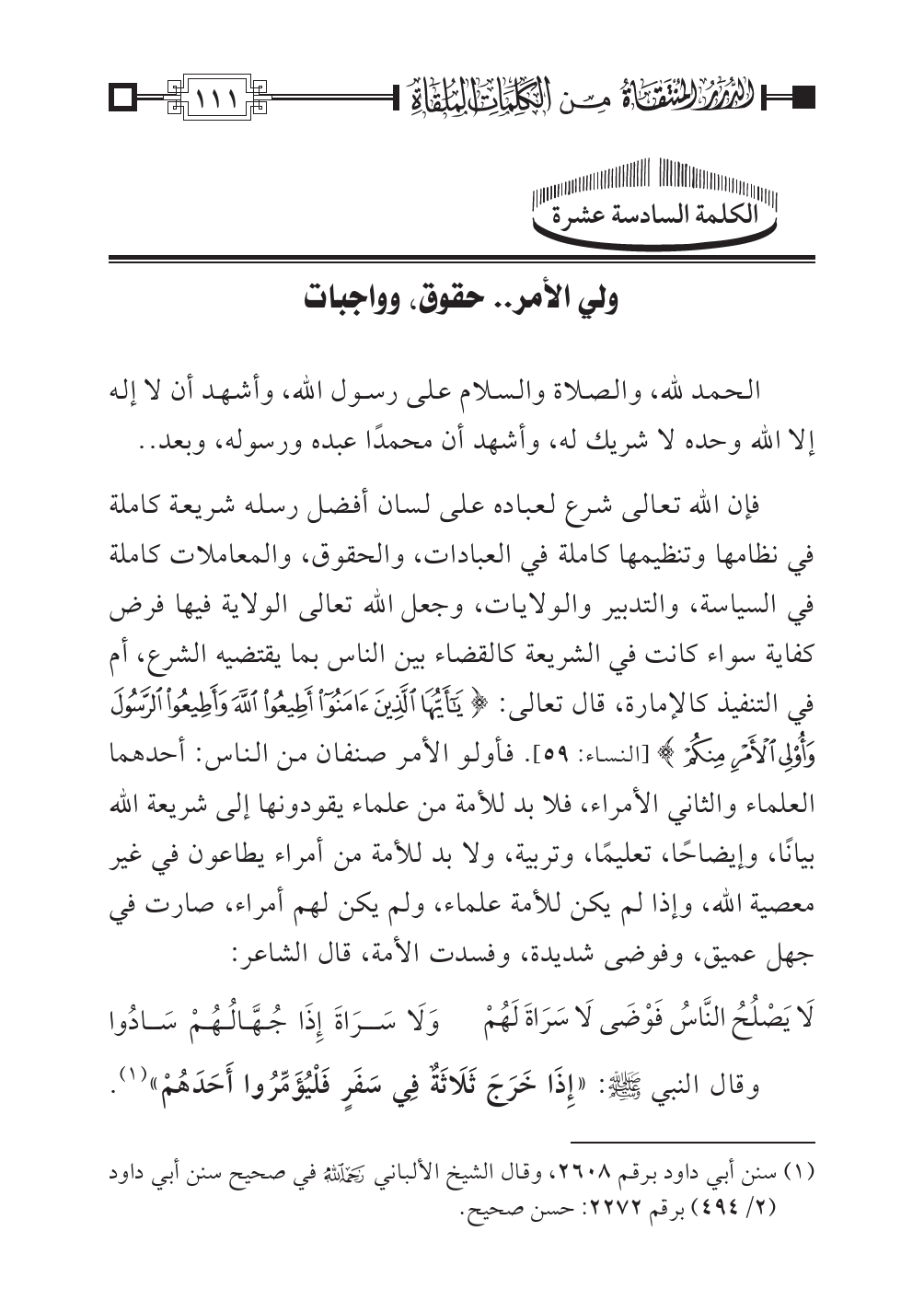 فإن الله تعالى شرع لعباده على لسان أفضل رسله شريعة كاملة في نظامها وتنظيمها كاملة في العبادات، والحقوق، والمعاملات كاملة في السياسة، والتدبير والولايات، وجعل الله تعالى الولاية فيها فرض كفاية سواء كانت في الشريعة كالقضاء بين الناس بما يقتضيه الشرع، أم في التنفيذ كالإمارة، قال تعالى: {يَاأَيُّهَا الَّذِينَ آمَنُوا أَطِيعُوا اللهَ وَأَطِيعُوا الرَّسُولَ وَأُوْلِي الأَمْرِ مِنكُمْ} [النساء: ٥٩]. فأولو الأمر صنفان من الناس: أحدهما العلماء والثاني الأمراء، فلا بد للأمة من علماء يقودونها إلى شريعة الله بيانًا، وإيضاحًا، تعليمًا، وتربية، ولا بد للأمة من أمراء يطاعون في غير معصية الله، وإذا لم يكن للأمة علماء، ولم يكن لهم أمراء، صارت في جهل عميق، وفوضى شديدة، وفسدت الأمة، قال الشاعر: