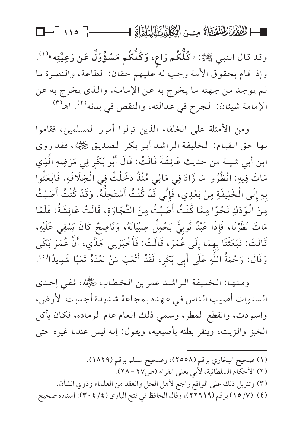 وقد قال النبي صلى الله عليه وسلم: «كُلُّكُم رَاعٍ، وَكُلُّكُم مَسْؤُوْلٌ عَن رَعِيَّتِه» (¬١). وإذا قام بحقوق الأمة وجب له عليهم حقان: الطاعة، والنصرة ما لم يوجد من جهته ما يخرج به عن الإمامة، والذي يخرج به عن الإمامة شيئان: الجرح في عدالته، والنقص في بدنه (¬٢). اهـ (¬٣)