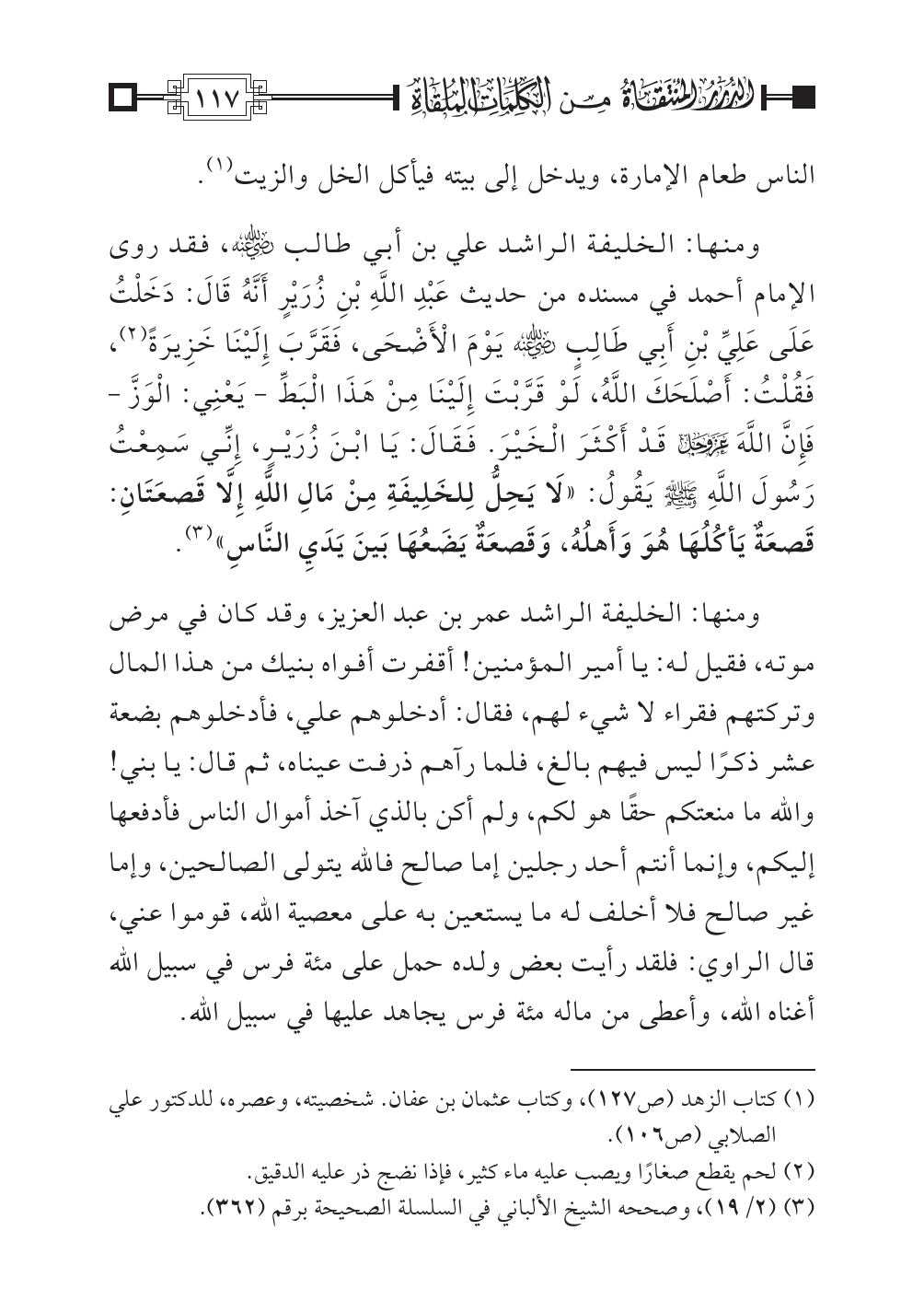 ومنها: الخليفة الراشد علي بن أبي طالب رضي الله عنه، فقد روى الإمام أحمد في مسنده من حديث عَبْدِ اللَّهِ بْنِ زُرَيْرٍ أَنَّهُ قَالَ: دَخَلْتُ عَلَى عَلِيِّ بْنِ أَبِي طَالِبٍ رضي الله عنه يَوْمَ الْأَضْحَى، فَقَرَّبَ إِلَيْنَا خَزِيرَةً (¬٢)، فَقُلْتُ: أَصْلَحَكَ اللَّهُ، لَوْ قَرَّبْتَ إِلَيْنَا مِنْ هَذَا الْبَطِّ - يَعْنِي: الْوَزَّ - فَإِنَّ اللَّهَ عز وجل قَدْ أَكْثَرَ الْخَيْرَ. فَقَالَ: يَا ابْنَ زُرَيْرٍ، إِنِّي سَمِعْتُ رَسُولَ اللَّهِ صلى الله عليه وسلم يَقُولُ: «لَا يَحِلُّ لِلخَلِيفَةِ مِنْ مَالِ اللَّهِ إِلَّا قَصعَتَانِ: قَصعَةٌ يَأكُلُهَا هُوَ وَأَهلُهُ، وَقَصعَةٌ يَضَعُهَا بَينَ يَدَيِ النَّاسِ» (¬٣).