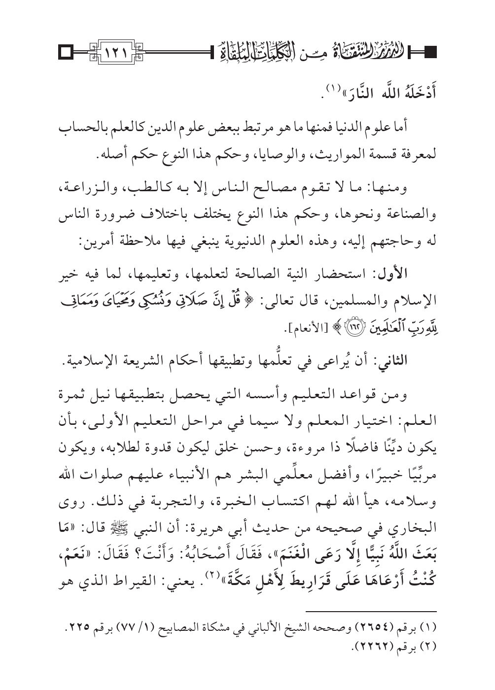 الأول: استحضار النية الصالحة لتعلمها، وتعليمها، لما فيه خير الإسلام والمسلمين، قال تعالى: {قُلْ إِنَّ صَلَاتِي وَنُسُكِي وَمَحْيَايَ وَمَمَاتِي لِلّهِ رَبِّ الْعَالَمِين} [الأنعام: ١٦٢].