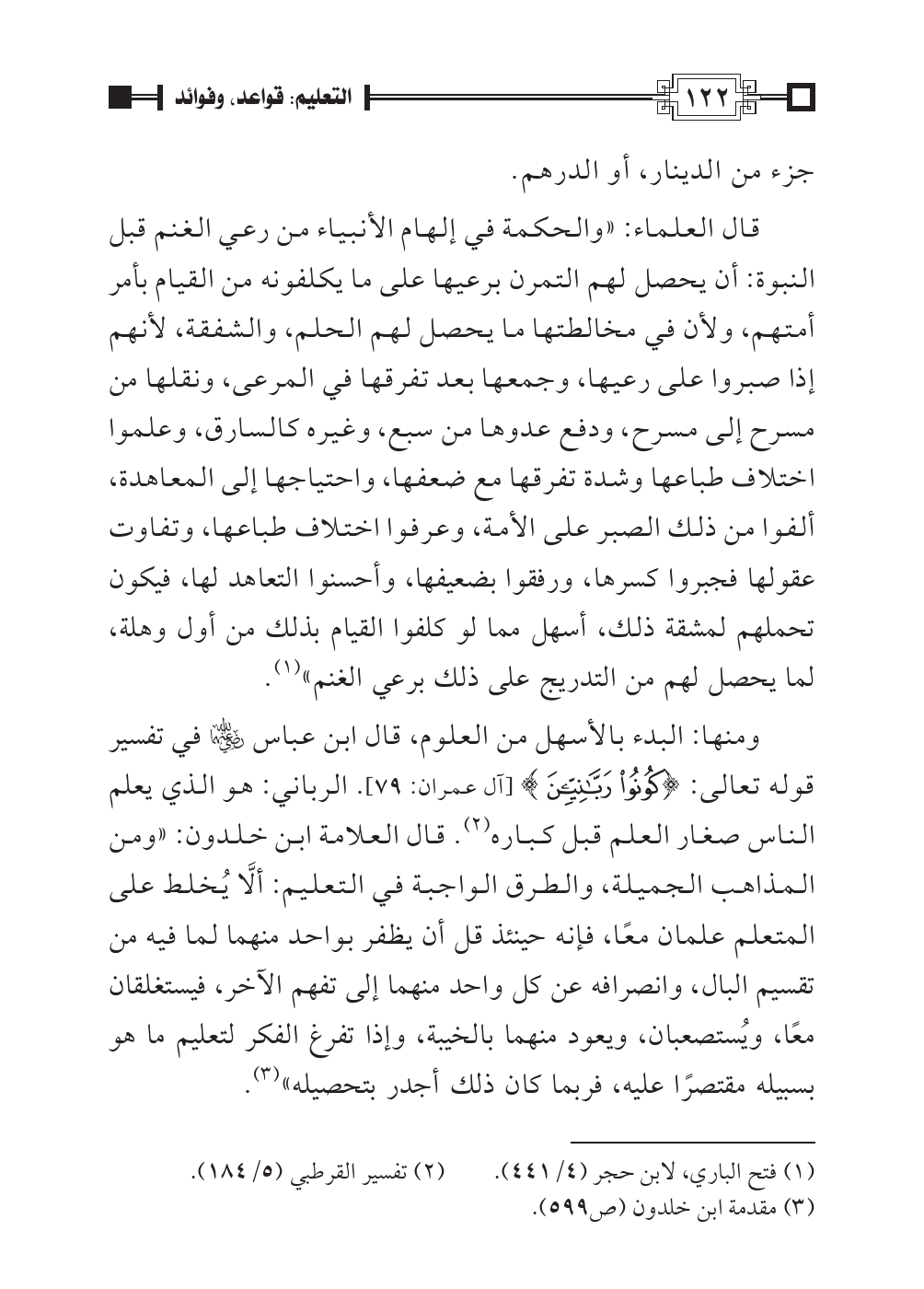 ومنها: البدء بالأسهل من العلوم، قال ابن عباس رضي الله عنهما في تفسير قوله تعالى: {كُونُوا رَبَّانِيِّينَ} [آل عمران: ٧٩]. الرباني: هو الذي يعلم الناس صغار العلم قبل كباره (¬٢). قال العلامة ابن خلدون: «ومن المذاهب الجميلة، والطرق الواجبة في التعليم: ألَّا يُخلط على المتعلم علمان معًا، فإنه حينئذ قل أن يظفر بواحد منهما لما فيه من تقسيم البال، وانصرافه عن كل واحد منهما إلى تفهم الآخر، فيستغلقان معًا، ويُستصعبان، ويعود منهما بالخيبة، وإذا تفرغ الفكر لتعليم ما هو بسبيله مقتصرًا عليه، فربما كان ذلك أجدر بتحصيله» (¬٣).