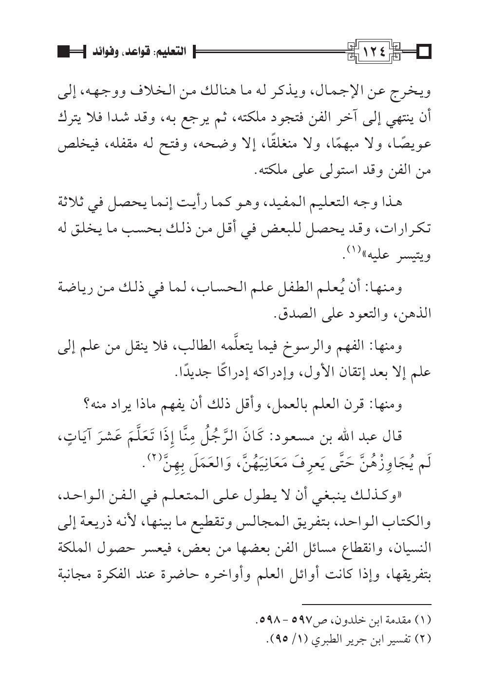 «وكذلك ينبغي أن لا يطول على المتعلم في الفن الواحد، والكتاب الواحد، بتفريق المجالس وتقطيع ما بينها، لأنه ذريعة إلى النسيان، وانقطاع مسائل الفن بعضها من بعض، فيعسر حصول الملكة بتفريقها، وإذا كانت أوائل العلم وأواخره حاضرة عند الفكرة مجانبة