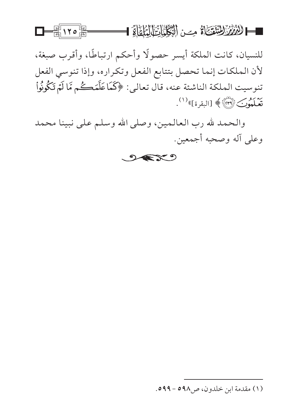 للنسيان، كانت الملكة أيسر حصولًا وأحكم ارتباطًا، وأقرب صبغة، لأن الملكات إنما تحصل بتتابع الفعل وتكراره، وإذا تنوسي الفعل تنوسيت الملكة الناشئة عنه، قال تعالى: {كَمَا عَلَّمَكُم مَّا لَمْ تَكُونُوا تَعْلَمُون} [البقرة: ٢٣٩]» (¬١).