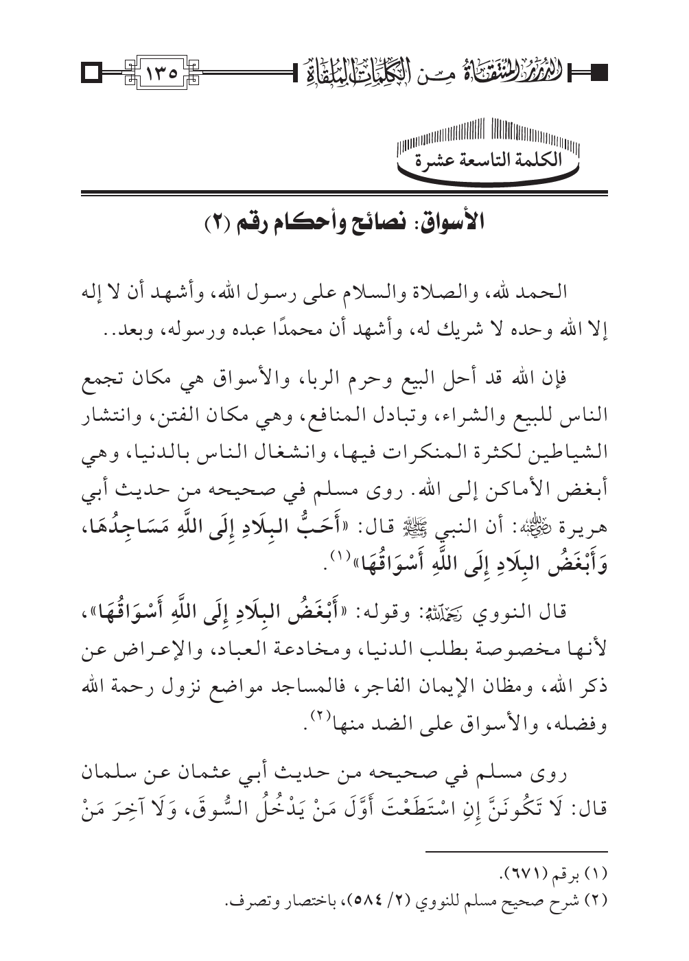 الكلمة التاسعة عشرة: الأسواق: نصائح وأحكام رقم (٢)