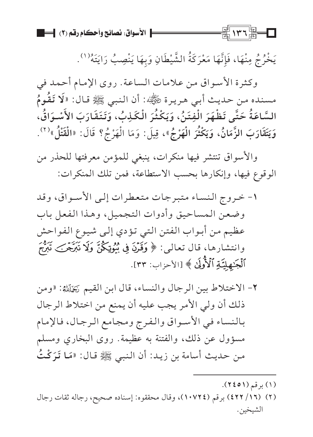 وكثرة الأسواق من علامات الساعة. روى الإمام أحمد في مسنده من حديث أبي هريرة رضي الله عنه: أن النبي صلى الله عليه وسلم قال: «لَا تَقُومُ السَّاعَةُ حَتَّى تَظْهَرَ الْفِتَنُ، وَيَكْثُرَ الْكَذِبُ، وَتَتَقَارَبَ الأَسْوَاقُ، وَيَتَقَارَبَ الزَّمَانُ، وَيَكْثُرَ الْهَرْجُ»، قِيلَ: وَمَا الْهَرْجُ؟ قَالَ: «الْقَتْلُ» (¬٢).