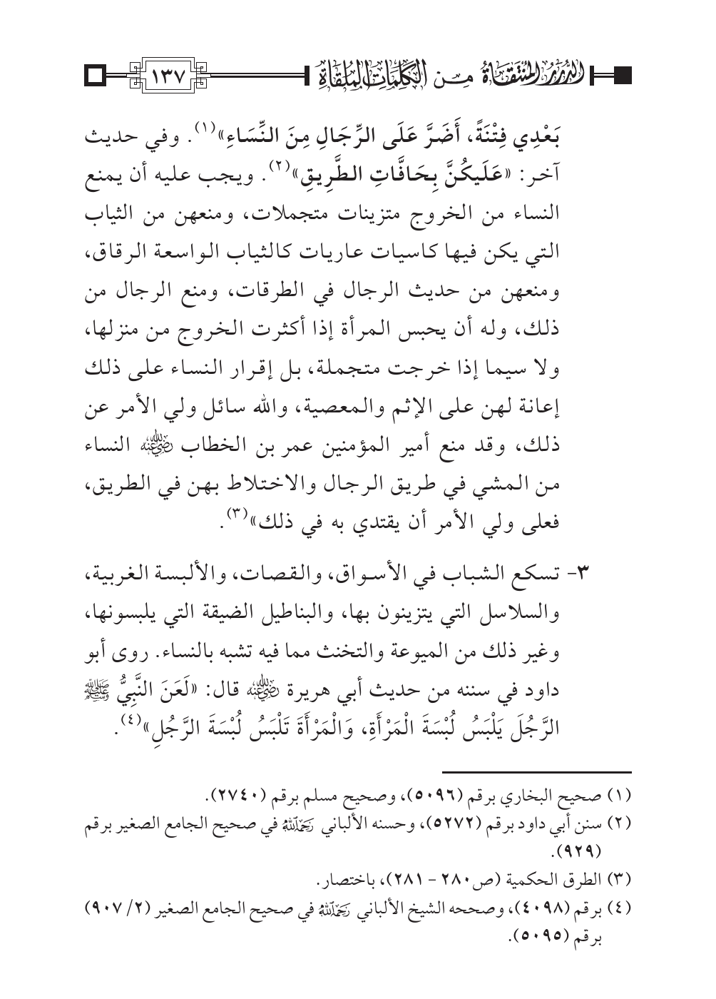 ٣ - تسكع الشباب في الأسواق، والقصات، والألبسة الغربية، والسلاسل التي يتزينون بها، والبناطيل الضيقة التي يلبسونها، وغير ذلك من الميوعة والتخنث مما فيه تشبه بالنساء. روى أبو داود في سننه من حديث أبي هريرة رضي الله عنه قال: «لَعَنَ النَّبِيُّ صلى الله عليه وسلم الرَّجُلَ يَلْبَسُ لُبْسَةَ الْمَرْأَةِ، وَالْمَرْأَةَ تَلْبَسُ لُبْسَةَ الرَّجُلِ» (¬٤).