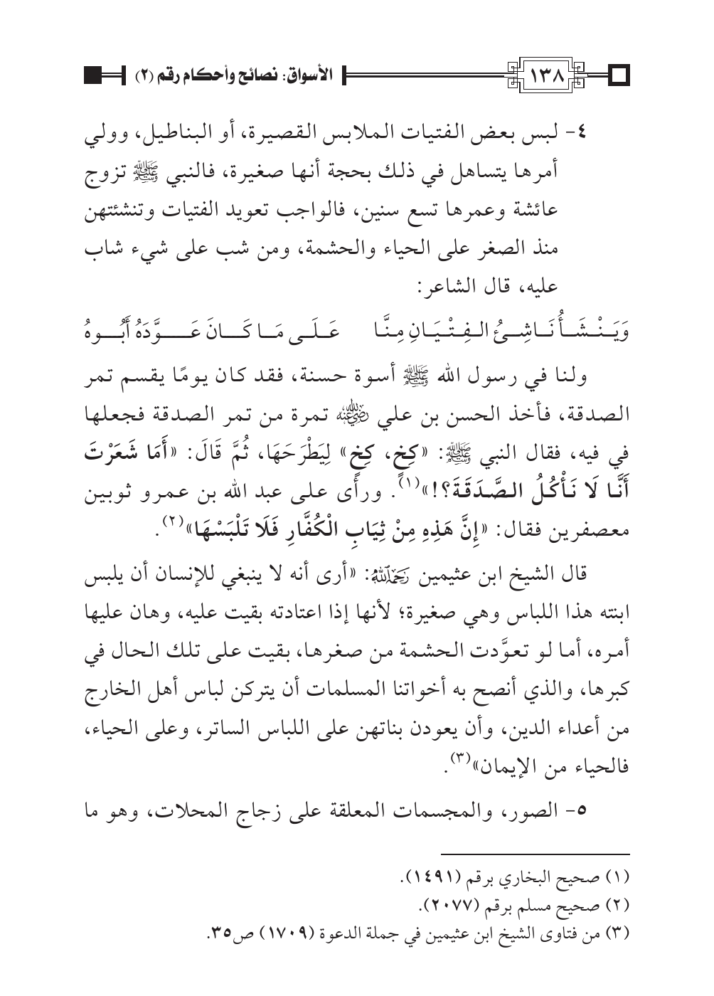 قال الشيخ ابن عثيمين رحمه الله: «أرى أنه لا ينبغي للإنسان أن يلبس ابنته هذا اللباس وهي صغيرة؛ لأنها إذا اعتادته بقيت عليه، وهان عليها أمره، أما لو تعوَّدت الحشمة من صغرها، بقيت على تلك الحال في كبرها، والذي أنصح به أخواتنا المسلمات أن يتركن لباس أهل الخارج من أعداء الدين، وأن يعودن بناتهن على اللباس الساتر، وعلى الحياء، فالحياء من الإيمان» (¬٣).