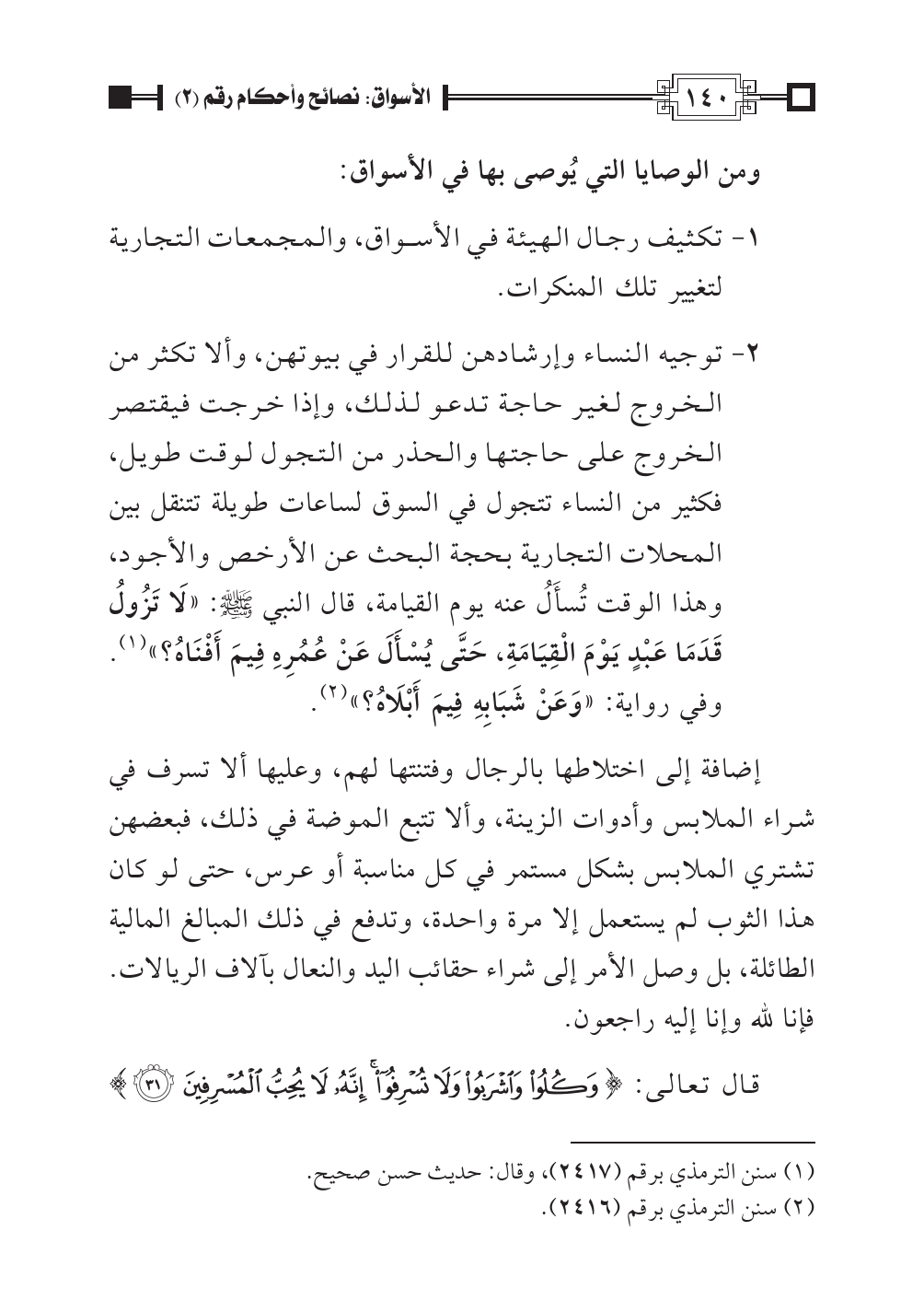 ٢ - توجيه النساء وإرشادهن للقرار في بيوتهن، وألا تكثر من الخروج لغير حاجة تدعو لذلك، وإذا خرجت فيقتصر الخروج على حاجتها والحذر من التجول لوقت طويل، فكثير من النساء تتجول في السوق لساعات طويلة تتنقل بين المحلات التجارية بحجة البحث عن الأرخص والأجود، وهذا الوقت تُسأَلُ عنه يوم القيامة، قال النبي صلى الله عليه وسلم: «لَا تَزُولُ قَدَمَا عَبْدٍ يَوْمَ الْقِيَامَةِ، حَتَّى يُسْأَلَ عَنْ عُمُرِهِ فِيمَ أَفْنَاهُ؟ » (¬١). وفي رواية: «وَعَنْ شَبَابِهِ فِيمَ أَبْلَاهُ؟ » (¬٢).
