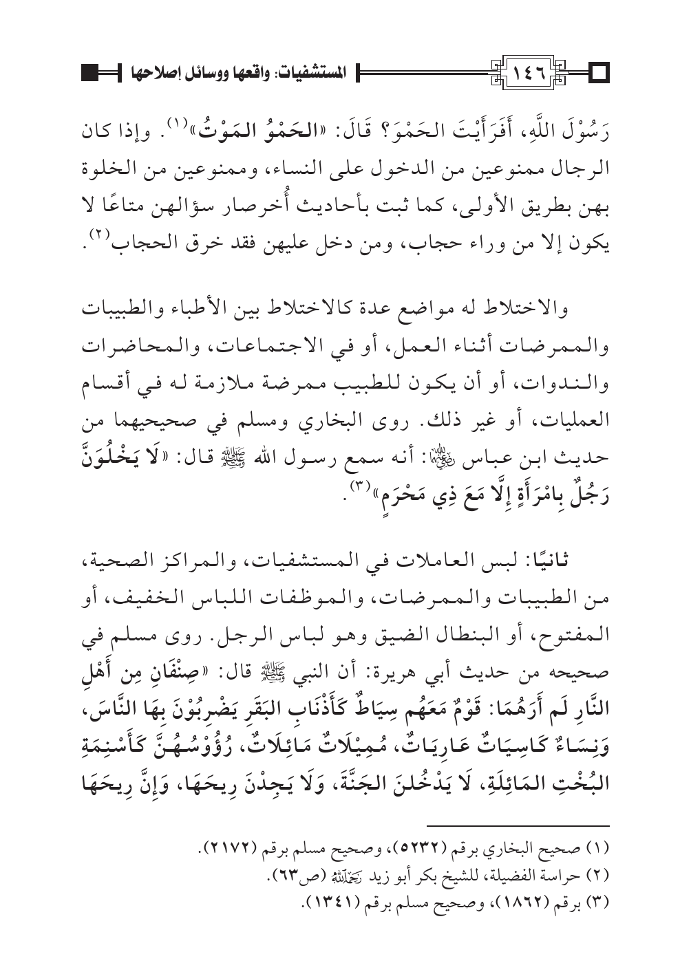 ثانيًا: لبس العاملات في المستشفيات، والمراكز الصحية، من الطبيبات والممرضات، والموظفات اللباس الخفيف، أو المفتوح، أو البنطال الضيق وهو لباس الرجل. روى مسلم في صحيحه من حديث أبي هريرة: أن النبي صلى الله عليه وسلم قال: «صِنْفَانِ مِن أَهْلِ النَّارِ لَم أَرَهُمَا: قَوْمٌ مَعَهُم سِيَاطٌ كَأَذْنَابِ البَقَرِ يَضْرِبُوْنَ بِهَا النَّاسَ، وَنِسَاءٌ كَاسِيَاتٌ عَارِيَاتٌ، مُمِيْلَاتٌ مَائِلَاتٌ، رُؤُوْسُهُنَّ كَأَسْنِمَةِ البُخْتِ المَائِلَةِ، لَا يَدْخُلنَ الجَنَّةَ، وَلَا يَجِدْنَ رِيحَهَا، وَإِنَّ رِيحَهَا