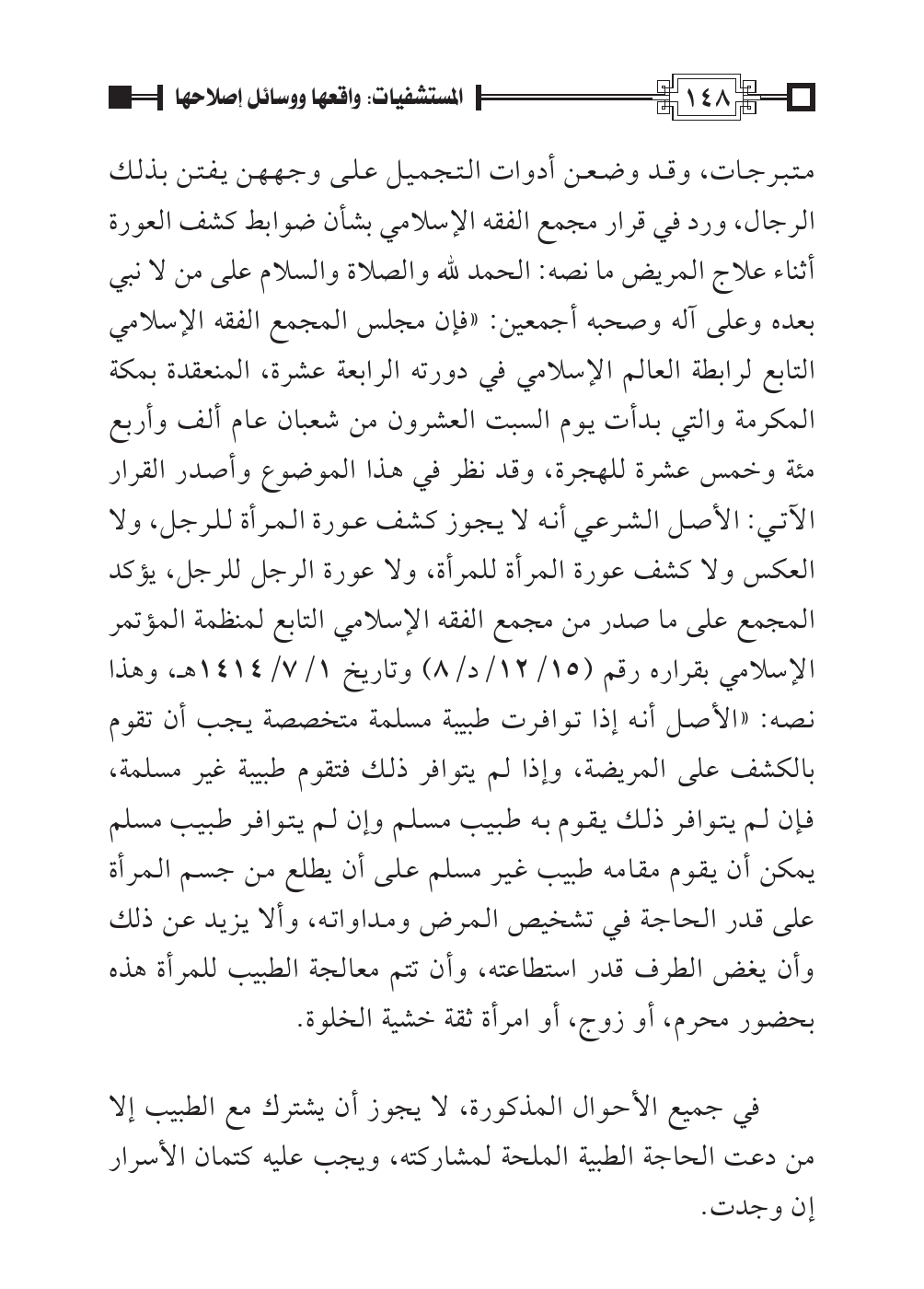 متبرجات، وقد وضعن أدوات التجميل على وجههن يفتن بذلك الرجال، ورد في قرار مجمع الفقه الإسلامي بشأن ضوابط كشف العورة أثناء علاج المريض ما نصه: الحمد لله والصلاة والسلام على من لا نبي بعده وعلى آله وصحبه أجمعين: «فإن مجلس المجمع الفقه الإسلامي التابع لرابطة العالم الإسلامي في دورته الرابعة عشرة، المنعقدة بمكة المكرمة والتي بدأت يوم السبت العشرون من شعبان عام ألف وأربع مئة وخمس عشرة للهجرة، وقد نظر في هذا الموضوع وأصدر القرار الآتي: الأصل الشرعي أنه لا يجوز كشف عورة المرأة للرجل، ولا العكس ولا كشف عورة المرأة للمرأة، ولا عورة الرجل للرجل، يؤكد المجمع على ما صدر من مجمع الفقه الإسلامي التابع لمنظمة المؤتمر الإسلامي بقراره رقم (١٥/ ١٢ / د/ ٨) وتاريخ ١/ ٧ / ١٤١٤ هـ، وهذا نصه: «الأصل أنه إذا توافرت طبيبة مسلمة متخصصة يجب أن تقوم بالكشف على المريضة، وإذا لم يتوافر ذلك فتقوم طبيبة غير مسلمة، فإن لم يتوافر ذلك يقوم به طبيب مسلم وإن لم يتوافر طبيب مسلم يمكن أن يقوم مقامه طبيب غير مسلم على أن يطلع من جسم المرأة على قدر الحاجة في تشخيص المرض ومداواته، وألا يزيد عن ذلك وأن يغض الطرف قدر استطاعته، وأن تتم معالجة الطبيب للمرأة هذه بحضور محرم، أو زوج، أو امرأة ثقة خشية الخلوة.