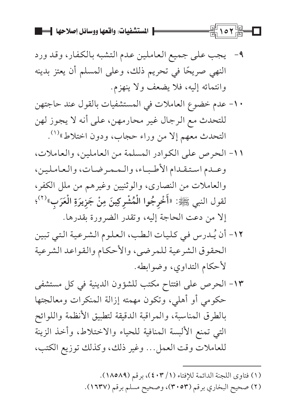 ١٣ - الحرص على افتتاح مكتب للشؤون الدينية في كل مستشفى حكومي أو أهلي، وتكون مهمته إزالة المنكرات ومعالجتها بالطرق المناسبة، والمراقبة الدقيقة لتطبيق الأنظمة واللوائح التي تمنع الألبسة المنافية للحياء والاختلاط، وأخذ الزينة للعاملات وقت العمل ... وغير ذلك، وكذلك توزيع الكتب،