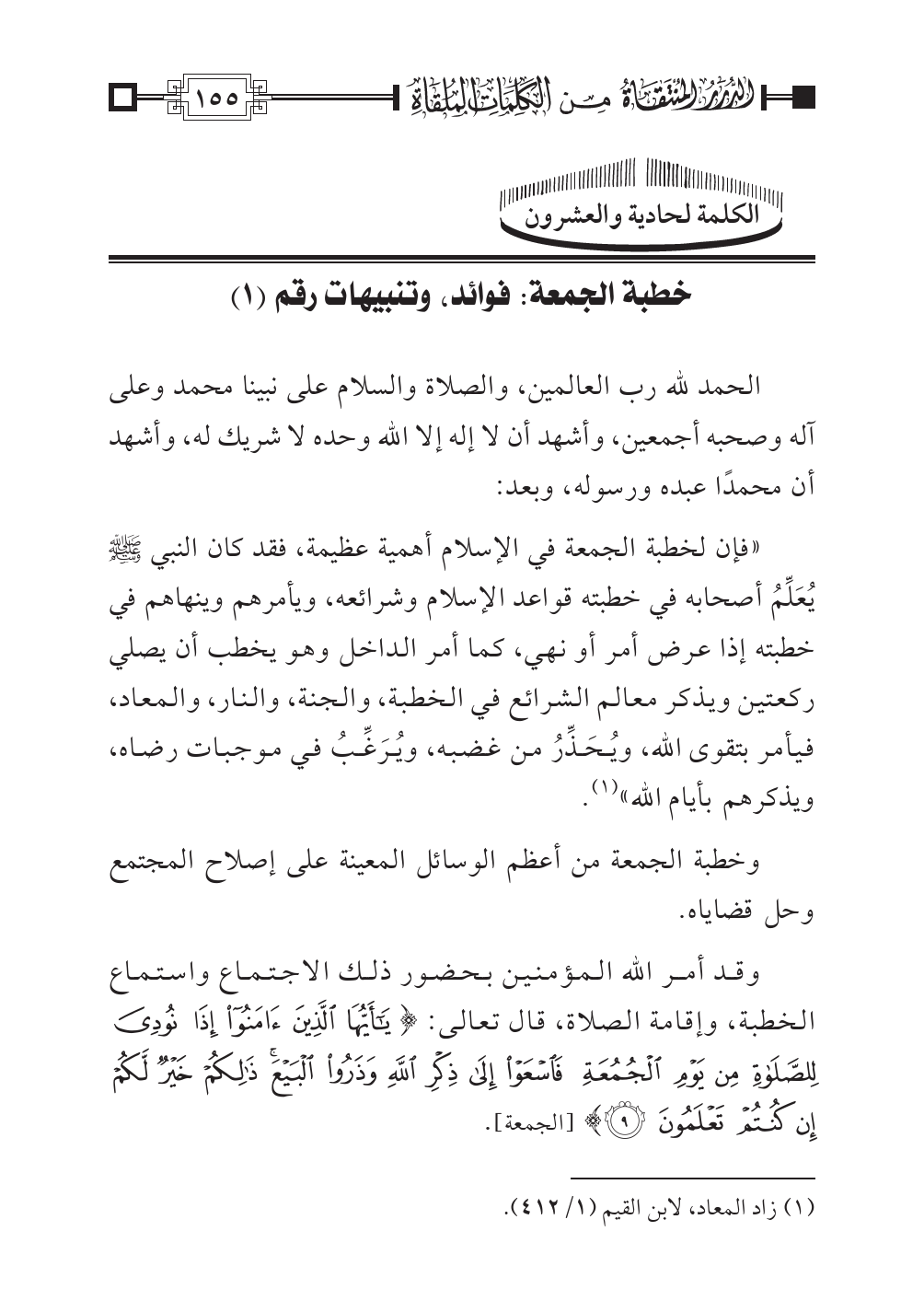 الكلمة لحادية والعشرون: خطبة الجمعة: فوائد، وتنبيهات رقم (١)