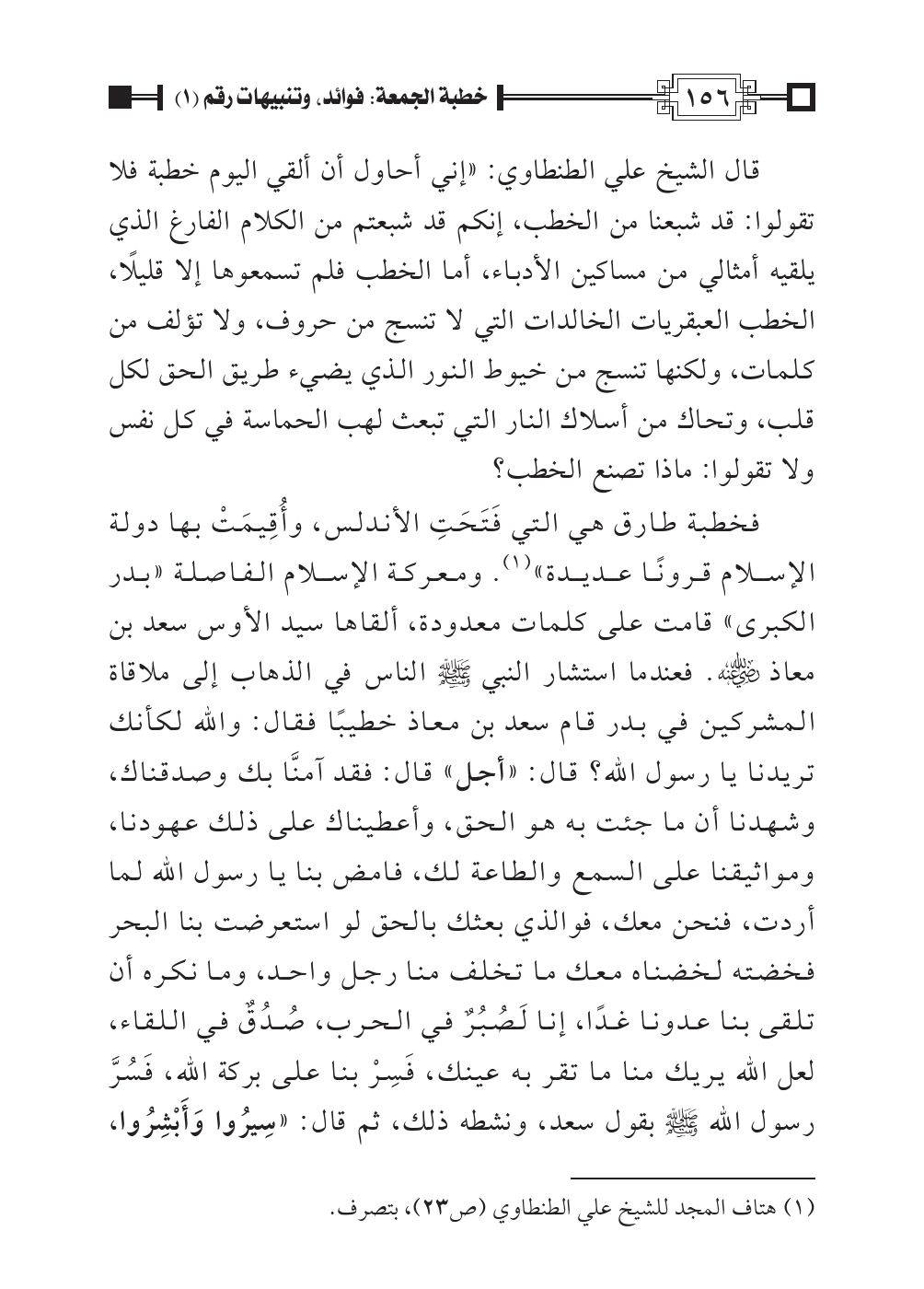 فخطبة طارق هي التي فَتَحَتِ الأندلس، وأُقِيمَتْ بها دولة الإسلام قرونًا عديدة» (¬١). ومعركة الإسلام الفاصلة «بدر الكبرى» قامت على كلمات معدودة، ألقاها سيد الأوس سعد بن معاذ رضي الله عنه. فعندما استشار النبي صلى الله عليه وسلم الناس في الذهاب إلى ملاقاة المشركين في بدر قام سعد بن معاذ خطيبًا فقال: والله لكأنك تريدنا يا رسول الله؟ قال: «أجل» قال: فقد آمنَّا بك وصدقناك، وشهدنا أن ما جئت به هو الحق، وأعطيناك على ذلك عهودنا، ومواثيقنا على السمع والطاعة لك، فامض بنا يا رسول الله لما أردت، فنحن معك، فوالذي بعثك بالحق لو استعرضت بنا البحر فخضته لخضناه معك ما تخلف منا رجل واحد، وما نكره أن تلقى بنا عدونا غدًا، إنا لَصُبُرٌ في الحرب، صُدُقٌ في اللقاء، لعل الله يريك منا ما تقر به عينك، فَسِرْ بنا على بركة الله، فَسُرَّ رسول الله صلى الله عليه وسلم بقول سعد، ونشطه ذلك، ثم قال: «سِيرُوا وَأَبْشِرُوا،