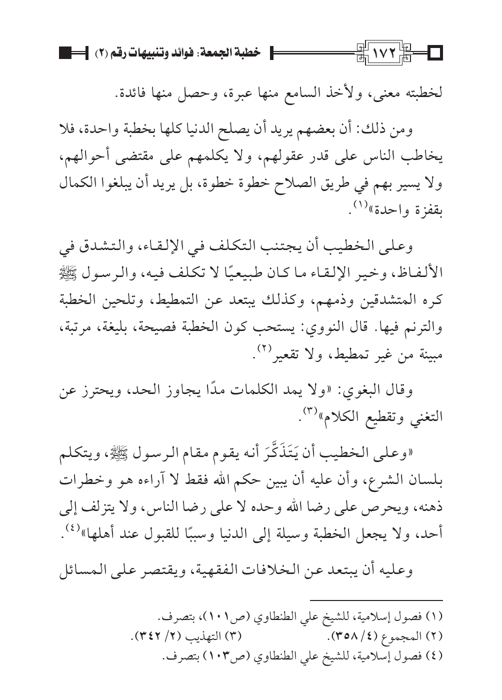 «وعلى الخطيب أن يَتَذَكَّرَ أنه يقوم مقام الرسول صلى الله عليه وسلم، ويتكلم بلسان الشرع، وأن عليه أن يبين حكم الله فقط لا آراءه هو وخطرات ذهنه، ويحرص على رضا الله وحده لا على رضا الناس، ولا يتزلف إلى أحد، ولا يجعل الخطبة وسيلة إلى الدنيا وسببًا للقبول عند أهلها» (¬٤).