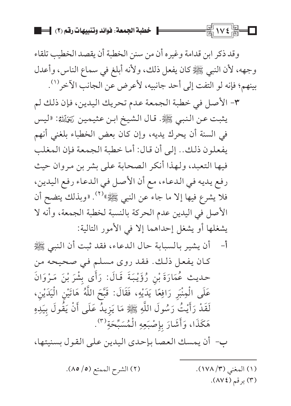 ٣ - الأصل في خطبة الجمعة عدم تحريك اليدين، فإن ذلك لم يثبت عن النبي صلى الله عليه وسلم. قال الشيخ ابن عثيمين رحمه الله: «ليس في السنة أن يحرك يديه، وإن كان بعض الخطباء بلغني أنهم يفعلون ذلك .. إلى أن قال: أما خطبة الجمعة فإن المغلب فيها التعبد، ولهذا أنكر الصحابة على بشر بن مروان حيث رفع يديه في الدعاء، مع أن الأصل في الدعاء رفع اليدين، فلا يشرع فيها إلا ما جاء عن النبي صلى الله عليه وسلم» (¬٢). «وبذلك يتضح أن الأصل في اليدين عدم الحركة بالنسبة لخطبة الجمعة، وأنه لا يشغلها أو يشغل إحداهما إلا في الأمور التالية: