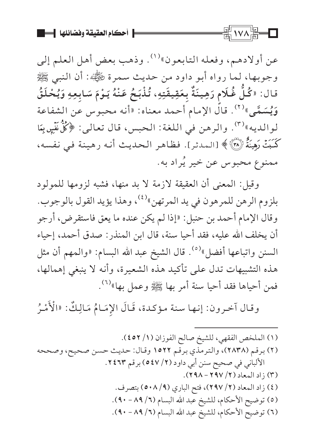 وقيل: المعنى أن العقيقة لازمة لا بد منها، فشبه لزومها للمولود بلزوم الرهن للمرهون في يد المرتهن» (¬٤)، وهذا يؤيد القول بالوجوب. وقال الإمام أحمد بن حنبل: «إذا لم يكن عنده ما يعق فاستقرض، أرجو أن يخلف الله عليه، فقد أحيا سنة، قال ابن المنذر: صدق أحمد، إحياء السنن واتباعها أفضل» (¬٥). قال الشيخ عبد الله البسام: «والمهم أن مثل هذه التشبيهات تدل على تأكيد هذه الشعيرة، وأنه لا ينبغي إهمالها، فمن أحياها فقد أحيا سنة أمر بها صلى الله عليه وسلم وعمل بها» (¬٦).