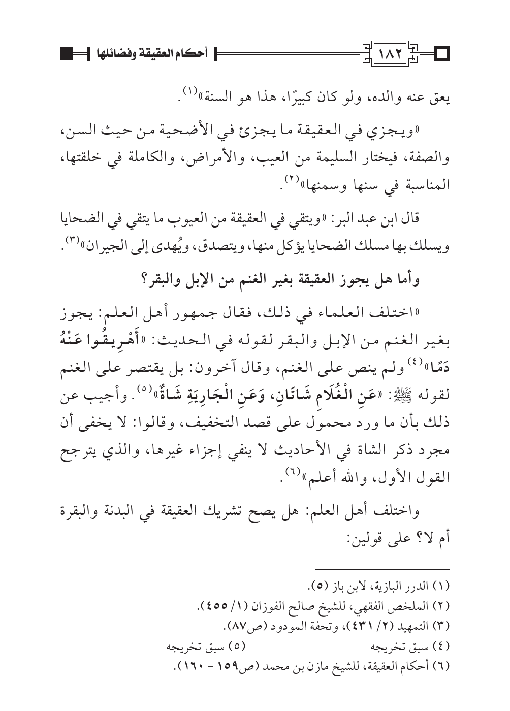 (¬٦) أحكام العقيقة، للشيخ مازن بن محمد (ص: ١٥٩ - ١٦٠).