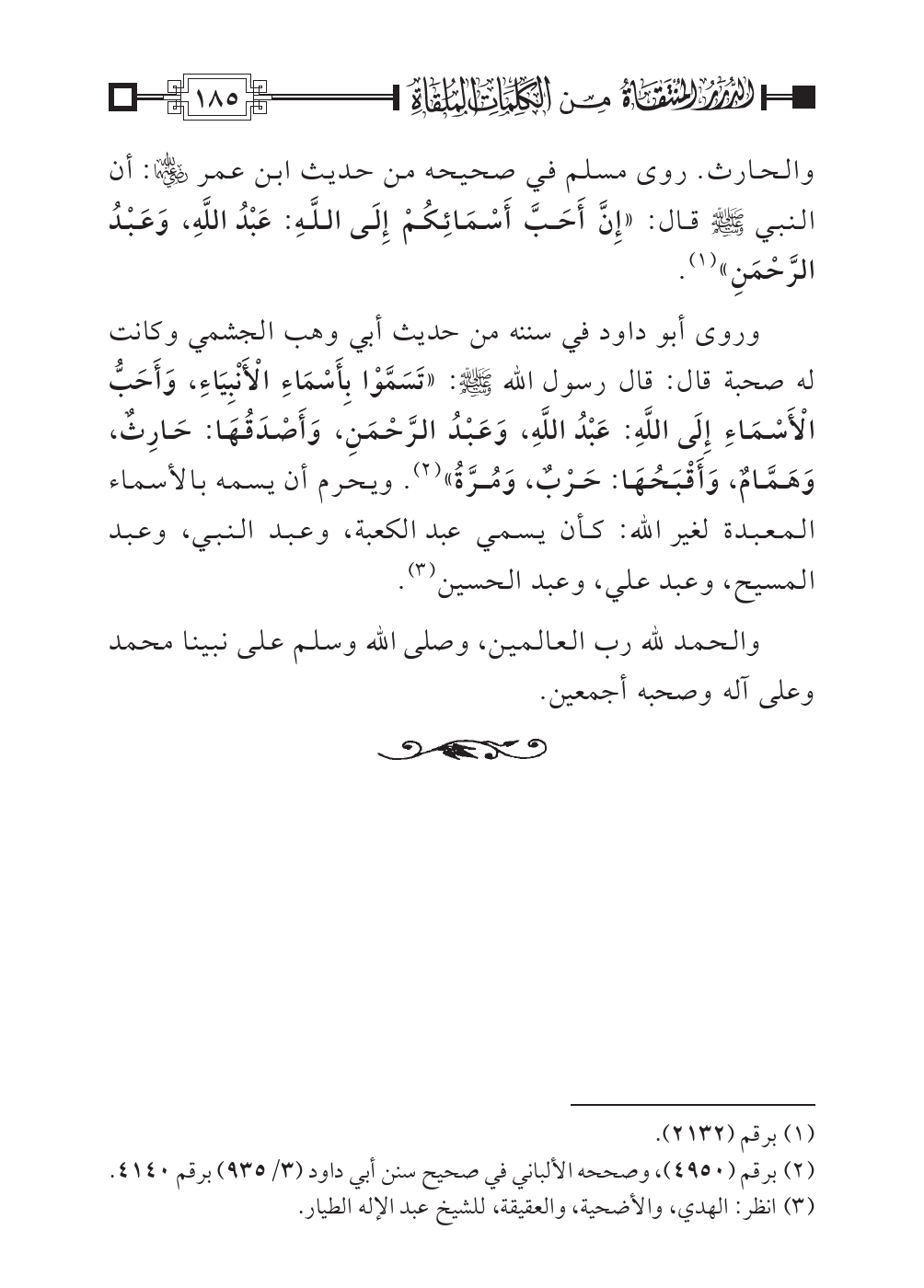 وروى أبو داود في سننه من حديث أبي وهب الجشمي وكانت له صحبة قال: قال رسول الله صلى الله عليه وسلم: «تَسَمَّوْا بِأَسْمَاءِ الْأَنْبِيَاءِ، وَأَحَبُّ الْأَسْمَاءِ إِلَى اللَّهِ: عَبْدُ اللَّهِ، وَعَبْدُ الرَّحْمَنِ، وَأَصْدَقُهَا: حَارِثٌ، وَهَمَّامٌ، وَأَقْبَحُهَا: حَرْبٌ، وَمُرَّةُ» (¬٢). ويحرم أن يسمه بالأسماء المعبدة لغير الله: كأن يسمي عبد الكعبة، وعبد النبي، وعبد المسيح، وعبد علي، وعبد الحسين (¬٣).