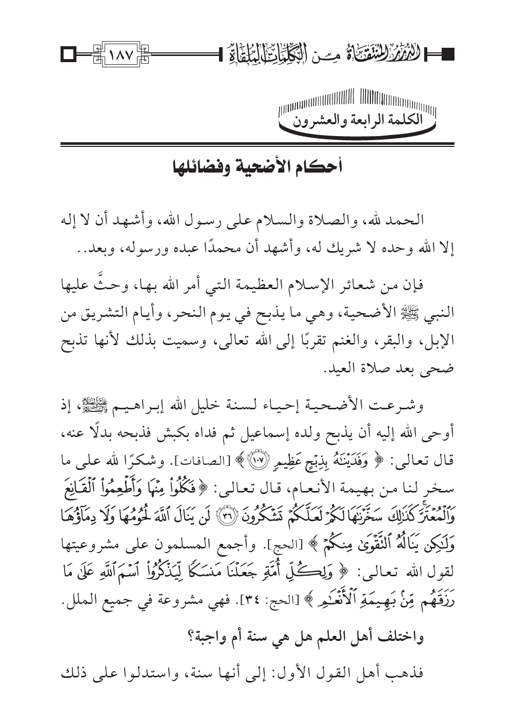 الكلمة الرابعة والعشرون: أحكام الأضحية وفضائلها