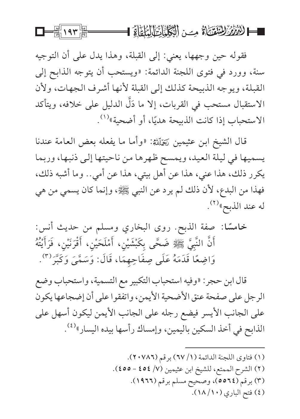 خامسًا: صفة الذبح. روى البخاري ومسلم من حديث أنس: أَنَّ النَّبِيَّ صلى الله عليه وسلم ضَحَّى بِكَبْشَيْنِ، أَمْلَحَيْنِ، أَقْرَنَيْنِ، فَرَأَيْتُهُ وَاضِعًا قَدَمَهُ عَلَى صِفَاحِهِمَا، قَالَ: وَسَمَّىَ وَكَبَّرَ (¬٣).