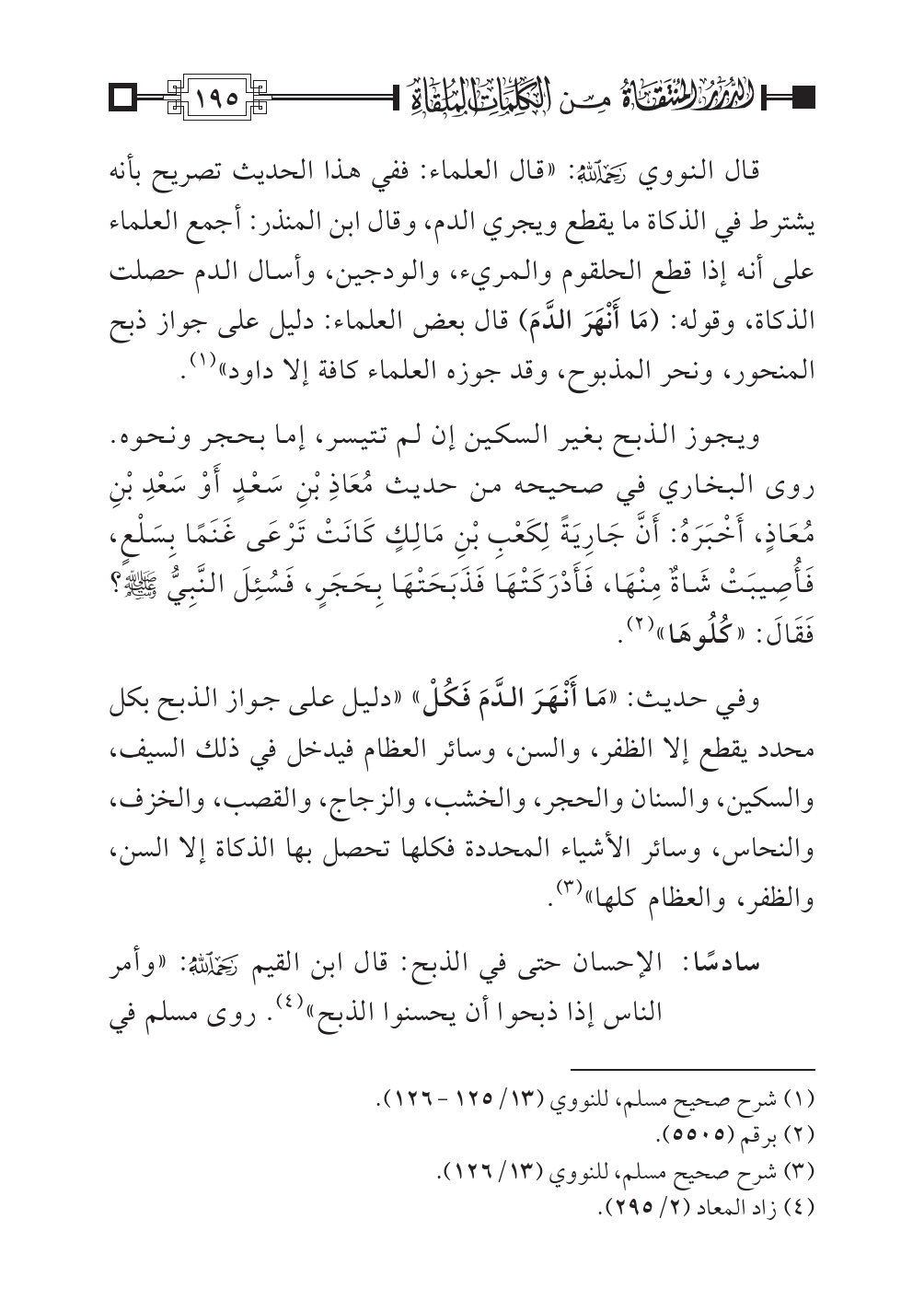 سادسًا: الإحسان حتى في الذبح: قال ابن القيم رحمه الله: «وأمر الناس إذا ذبحوا أن يحسنوا الذبح» (¬٤). روى مسلم في