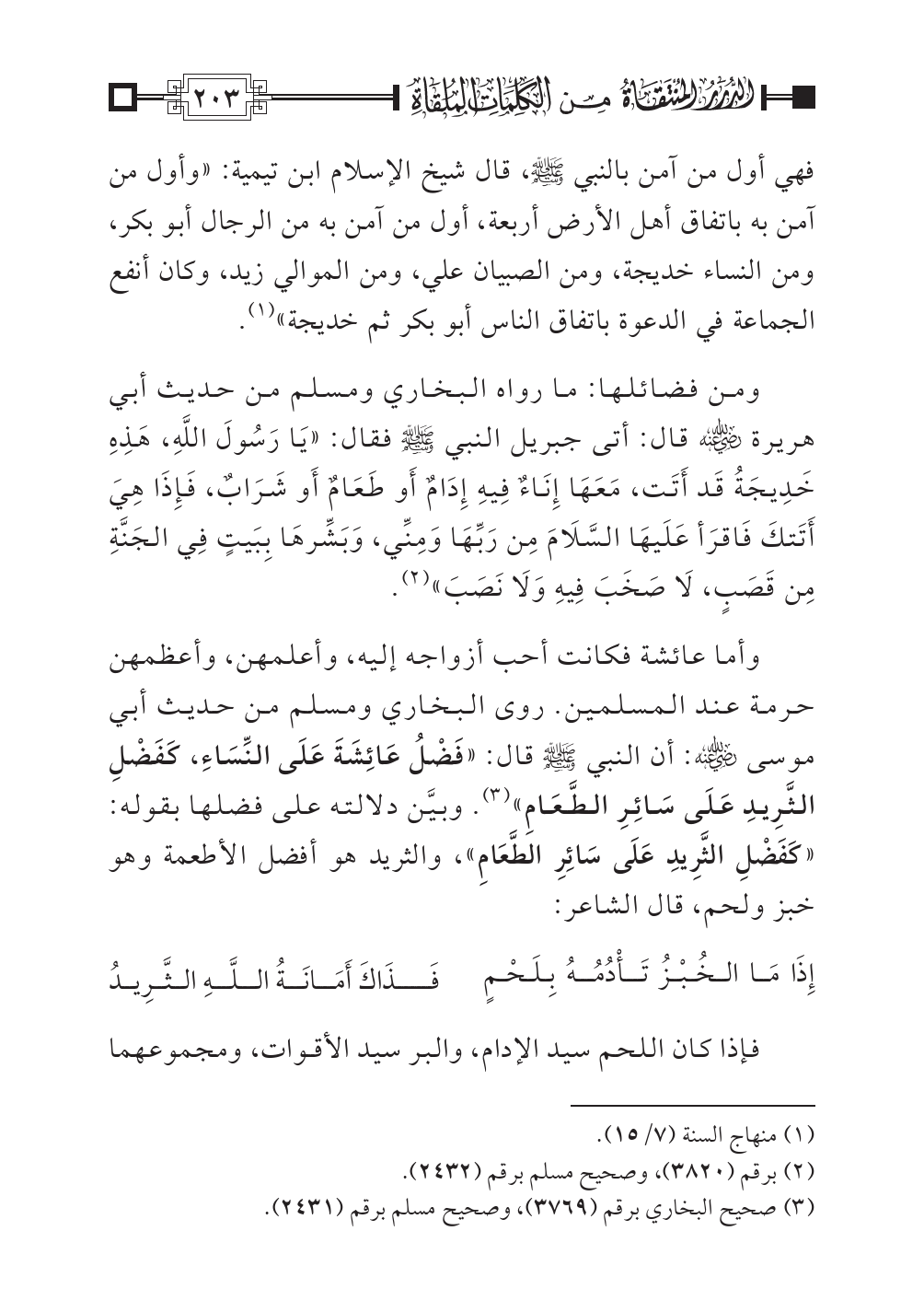 وأما عائشة فكانت أحب أزواجه إليه، وأعلمهن، وأعظمهن حرمة عند المسلمين. روى البخاري ومسلم من حديث أبي موسى رضي الله عنه: أن النبي صلى الله عليه وسلم قال: «فَضْلُ عَائِشَةَ عَلَى النِّسَاءِ، كَفَضْلِ الثَّرِيدِ عَلَى سَائِرِ الطَّعَامِ» (¬٣). وبيَّن دلالته على فضلها بقوله: «كَفَضْلِ الثَّرِيدِ عَلَى سَائِرِ الطَّعَامِ»، والثريد هو أفضل الأطعمة وهو خبز ولحم، قال الشاعر: