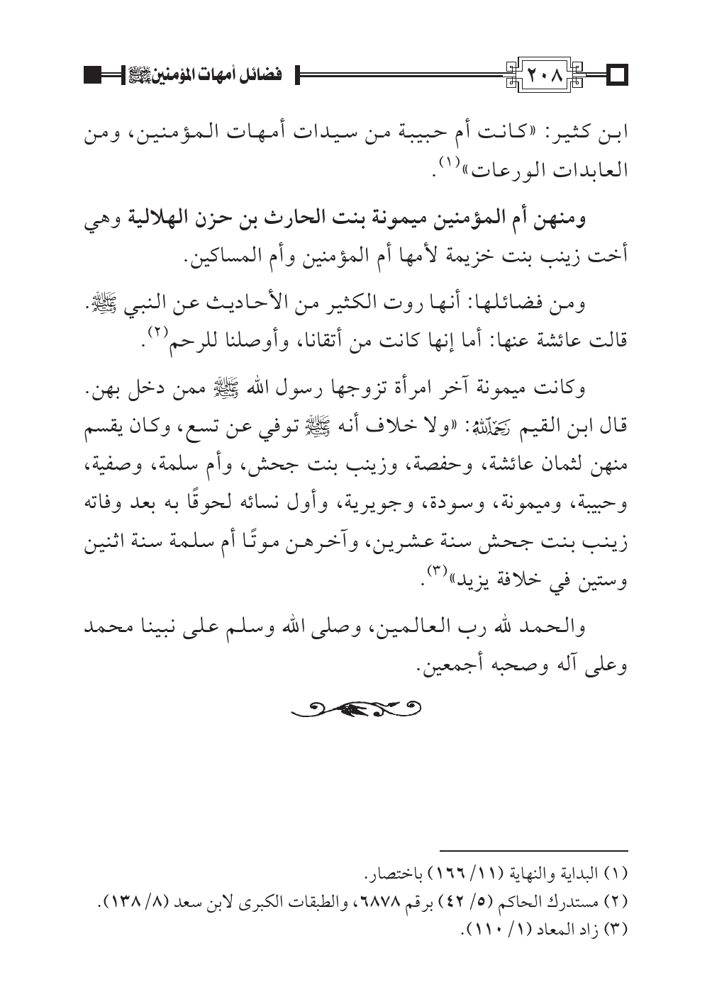 ومنهن أم المؤمنين ميمونة بنت الحارث بن حزن الهلالية وهي أخت زينب بنت خزيمة لأمها أم المؤمنين وأم المساكين.