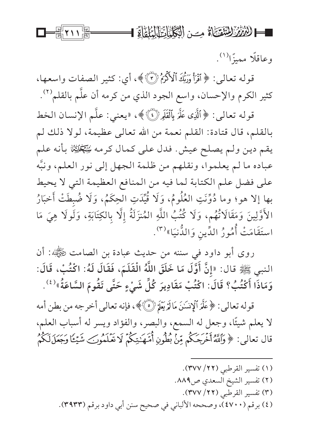 قوله تعالى: {الَّذِي عَلَّمَ بِالْقَلَم}، «يعني: علَّم الإنسان الخط بالقلم، قال قتادة: القلم نعمة من الله تعالى عظيمة، لولا ذلك لم يقم دين ولم يصلح عيش. فدل على كمال كرمه سبحانه بأنه علم عباده ما لم يعلموا، ونقلهم من ظلمة الجهل إلى نور العلم، ونبَّه على فضل علم الكتابة لما فيه من المنافع العظيمة التي لا يحيط بها إلا هو؛ وما دُوِّنَتِ العُلُومُ، وَلَا قُيِّدَتِ الحِكَمُ، وَلَا ضُبِطَتْ أَخبَارُ الأَوَّلِينَ وَمَقَالَاتُهُم، وَلَا كُتُبُ اللَّهِ المُنزَلَةُ إِلَّا بِالكِتَابَةِ، وَلَولَا هِيَ مَا استَقَامَتْ أُمُورُ الدِّينِ وَالدُّنيَا» (¬٣).