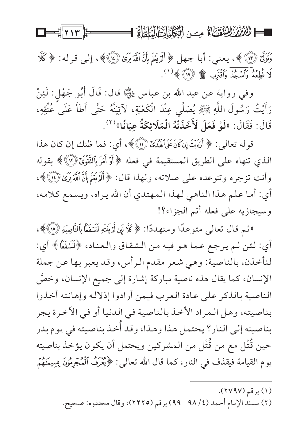 «ثم قال تعالى متوعدًا ومتهددًا: {كَلَاّ لَئِن لَّمْ يَنتَهِ لَنَسْفَعًا بِالنَّاصِيَة}، أي: لئن لم يرجع عما هو فيه من الشقاق والعناد، {لَنَسْفَعًا} أي: لنأخذن، بالناصية: وهي شعر مقدم الرأس، وقد يعبر بها عن جملة الإنسان، كما يقال هذه ناصية مباركة إشارة إلى جميع الإنسان، وخصَّ الناصية بالذكر على عادة العرب فيمن أرادوا إذلاله وإهانته أخذوا بناصيته، وهل المراد الأخذ بالناصية في الدنيا أو في الآخرة يجر بناصيته إلى النار؟ يحتمل هذا وهذا، وقد أُخذ بناصيته في يوم بدر حين قُتْل مع من قُتْل من المشركين ويحتمل أن يكون يؤخذ بناصيته يوم القيامة فيقذف في النار، كما قال الله تعالى: {يُعْرَفُ الْمُجْرِمُونَ بِسِيمَاهُمْ
