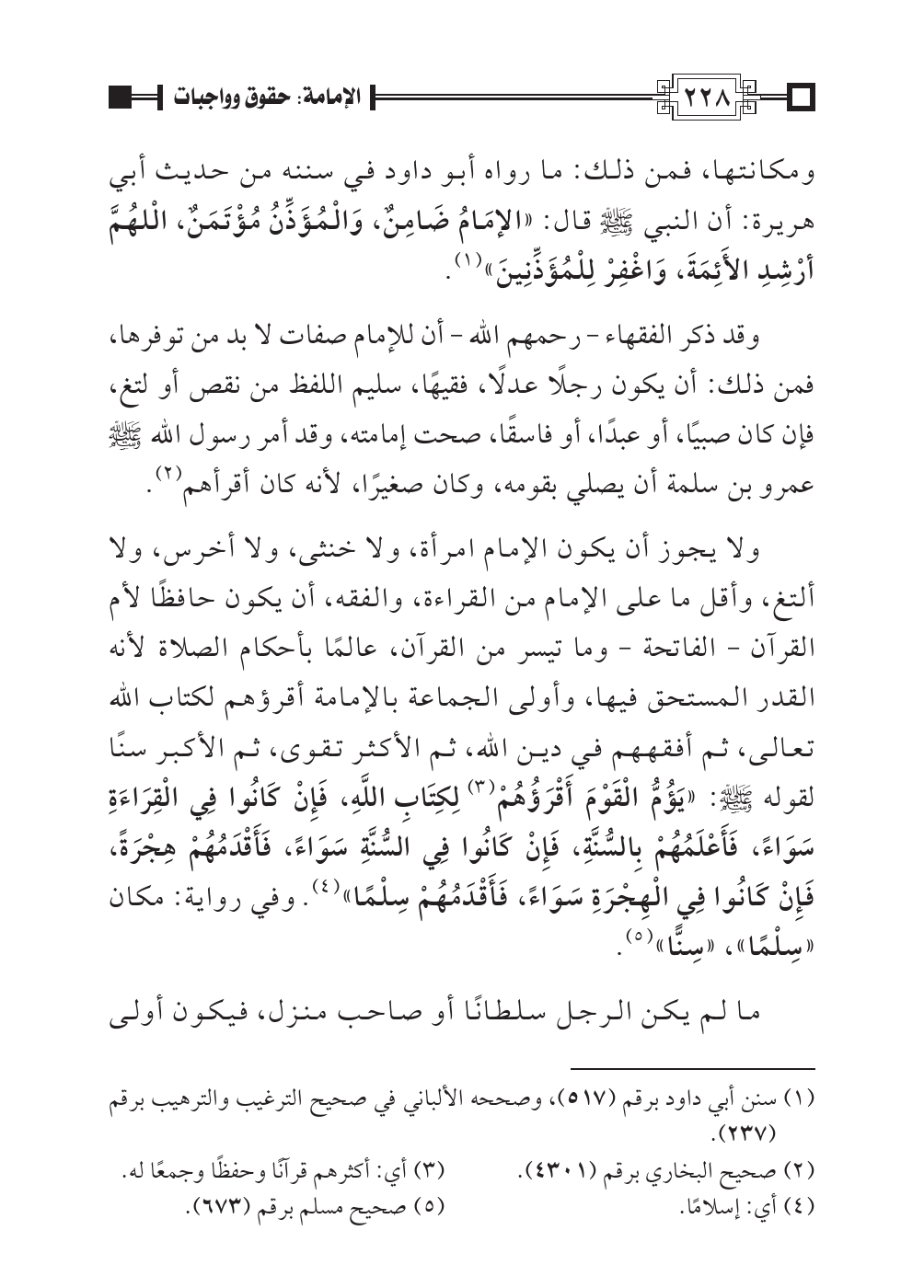 ولا يجوز أن يكون الإمام امرأة، ولا خنثى، ولا أخرس، ولا ألتغ، وأقل ما على الإمام من القراءة، والفقه، أن يكون حافظًا لأم القرآن - الفاتحة - وما تيسر من القرآن، عالمًا بأحكام الصلاة لأنه القدر المستحق فيها، وأولى الجماعة بالإمامة أقرؤهم لكتاب الله تعالى، ثم أفقههم في دين الله، ثم الأكثر تقوى، ثم الأكبر سنًا لقوله صلى الله عليه وسلم: «يَؤُمُّ الْقَوْمَ أَقْرَؤُهُمْ (¬٣) لِكِتَابِ اللَّهِ، فَإِنْ كَانُوا فِي الْقِرَاءَةِ سَوَاءً، فَأَعْلَمُهُمْ بِالسُّنَّةِ، فَإِنْ كَانُوا فِي السُّنَّةِ سَوَاءً، فَأَقْدَمُهُمْ هِجْرَةً، فَإِنْ كَانُوا فِي الْهِجْرَةِ سَوَاءً، فَأَقْدَمُهُمْ سِلْمًا» (¬٤). وفي رواية: مكان «سِلْمًا»، «سِنًّا» (¬٥).