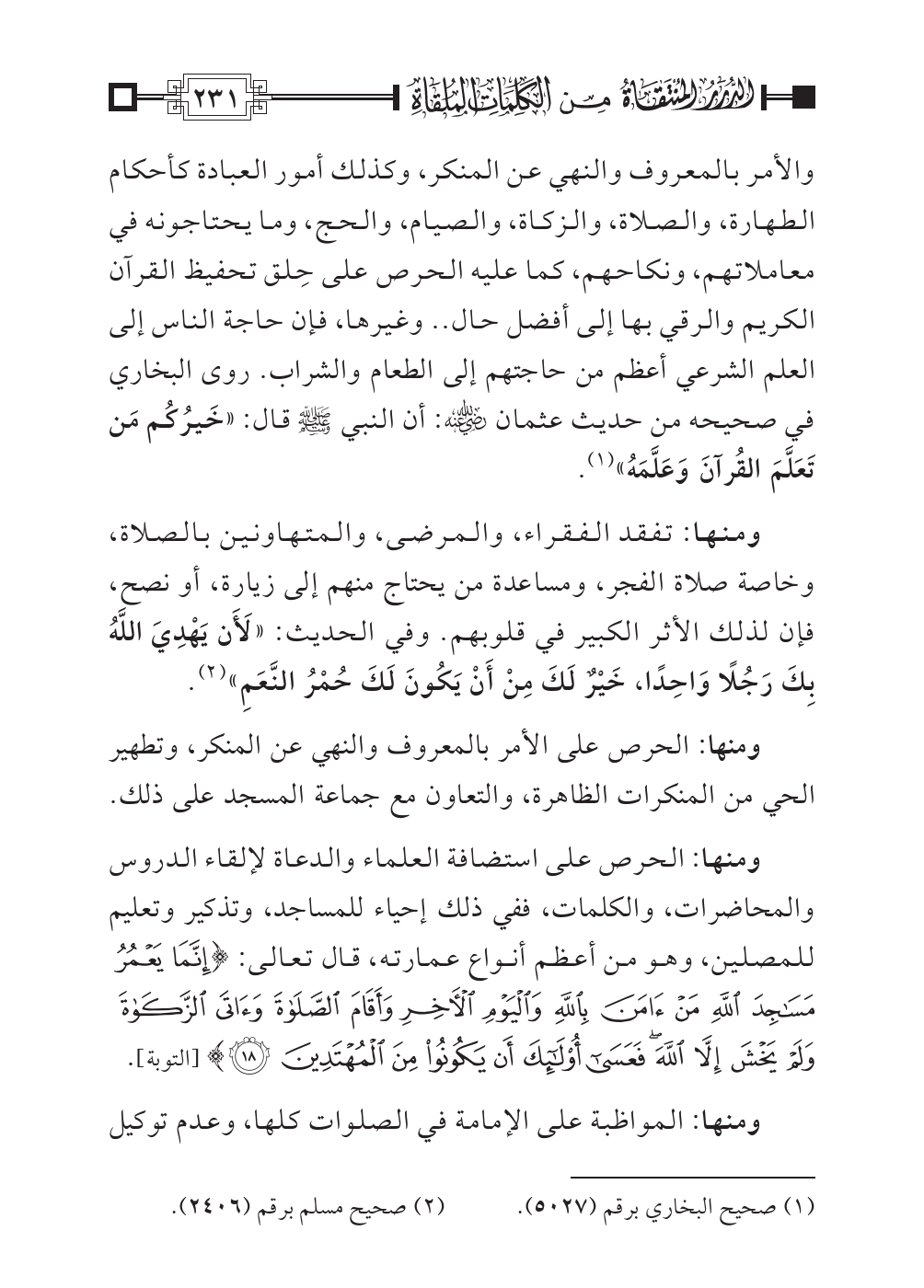 والأمر بالمعروف والنهي عن المنكر، وكذلك أمور العبادة كأحكام الطهارة، والصلاة، والزكاة، والصيام، والحج، وما يحتاجونه في معاملاتهم، ونكاحهم، كما عليه الحرص على حِلق تحفيظ القرآن الكريم والرقي بها إلى أفضل حال .. وغيرها، فإن حاجة الناس إلى العلم الشرعي أعظم من حاجتهم إلى الطعام والشراب. روى البخاري في صحيحه من حديث عثمان رضي الله عنه: أن النبي صلى الله عليه وسلم قال: «خَيرُكُم مَن تَعَلَّمَ القُرآنَ وَعَلَّمَهُ» (¬١).