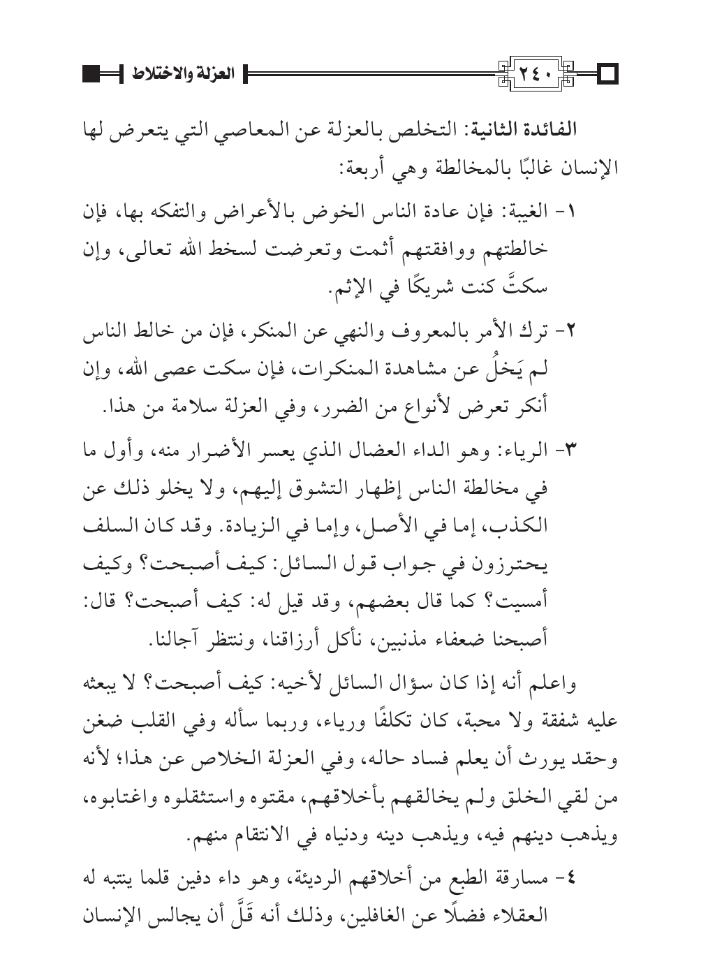 الفائدة الثانية: التخلص بالعزلة عن المعاصي التي يتعرض لها الإنسان غالبًا بالمخالطة وهي أربعة: