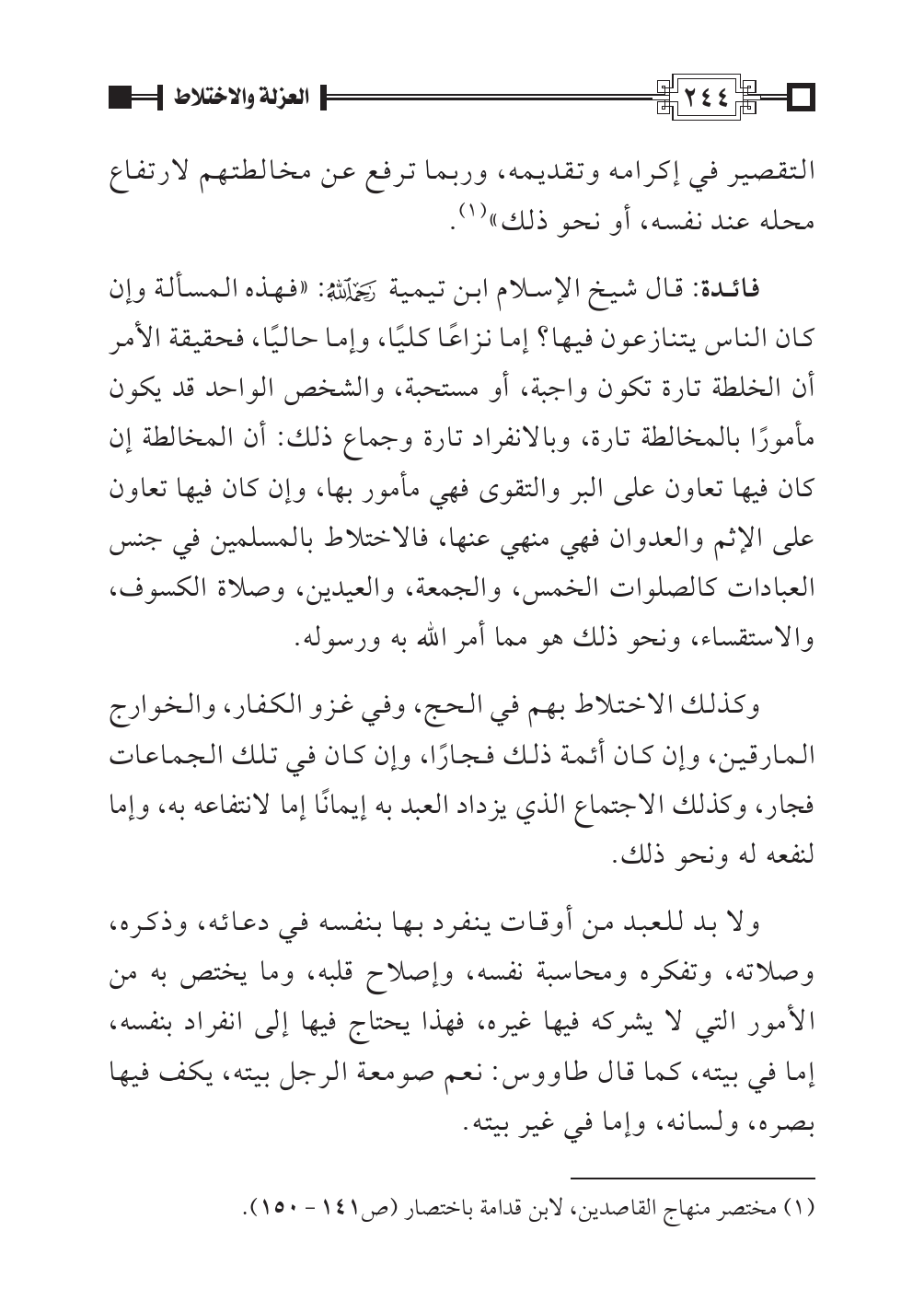 فائدة: قال شيخ الإسلام ابن تيمية رحمه الله: «فهذه المسألة وإن كان الناس يتنازعون فيها؟ إما نزاعًا كليًا، وإما حاليًا، فحقيقة الأمر أن الخلطة تارة تكون واجبة، أو مستحبة، والشخص الواحد قد يكون مأمورًا بالمخالطة تارة، وبالانفراد تارة وجماع ذلك: أن المخالطة إن كان فيها تعاون على البر والتقوى فهي مأمور بها، وإن كان فيها تعاون على الإثم والعدوان فهي منهي عنها، فالاختلاط بالمسلمين في جنس العبادات كالصلوات الخمس، والجمعة، والعيدين، وصلاة الكسوف، والاستقساء، ونحو ذلك هو مما أمر الله به ورسوله.