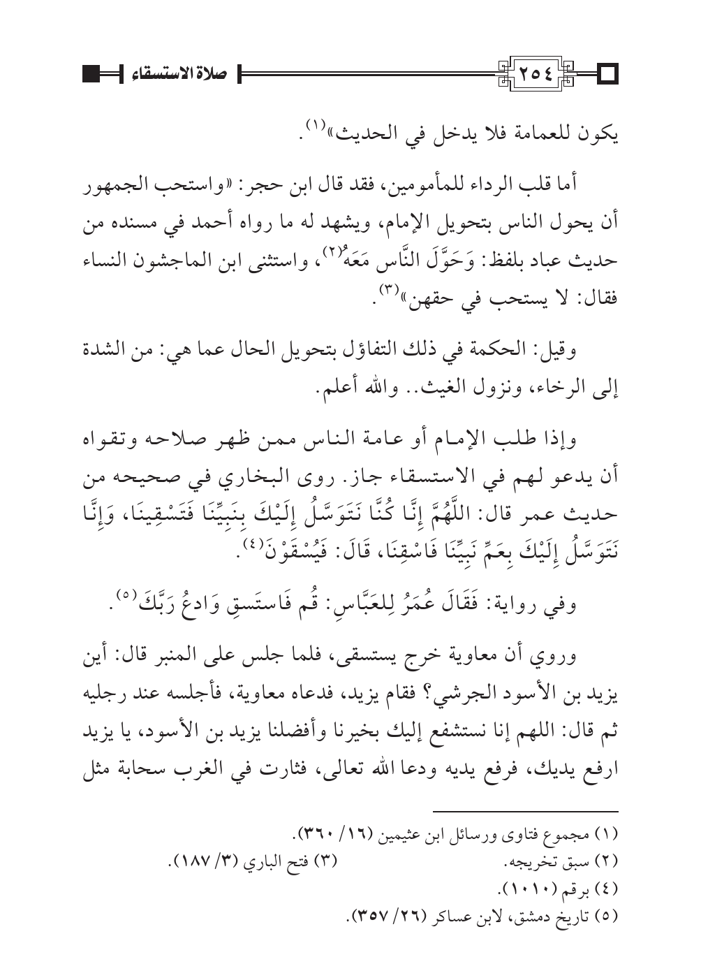 أما قلب الرداء للمأمومين، فقد قال ابن حجر: «واستحب الجمهور أن يحول الناس بتحويل الإمام، ويشهد له ما رواه أحمد في مسنده من حديث عباد بلفظ: وَحَوَّلَ النَّاس مَعَهُ (¬٢)، واستثنى ابن الماجشون النساء فقال: لا يستحب في حقهن» (¬٣).