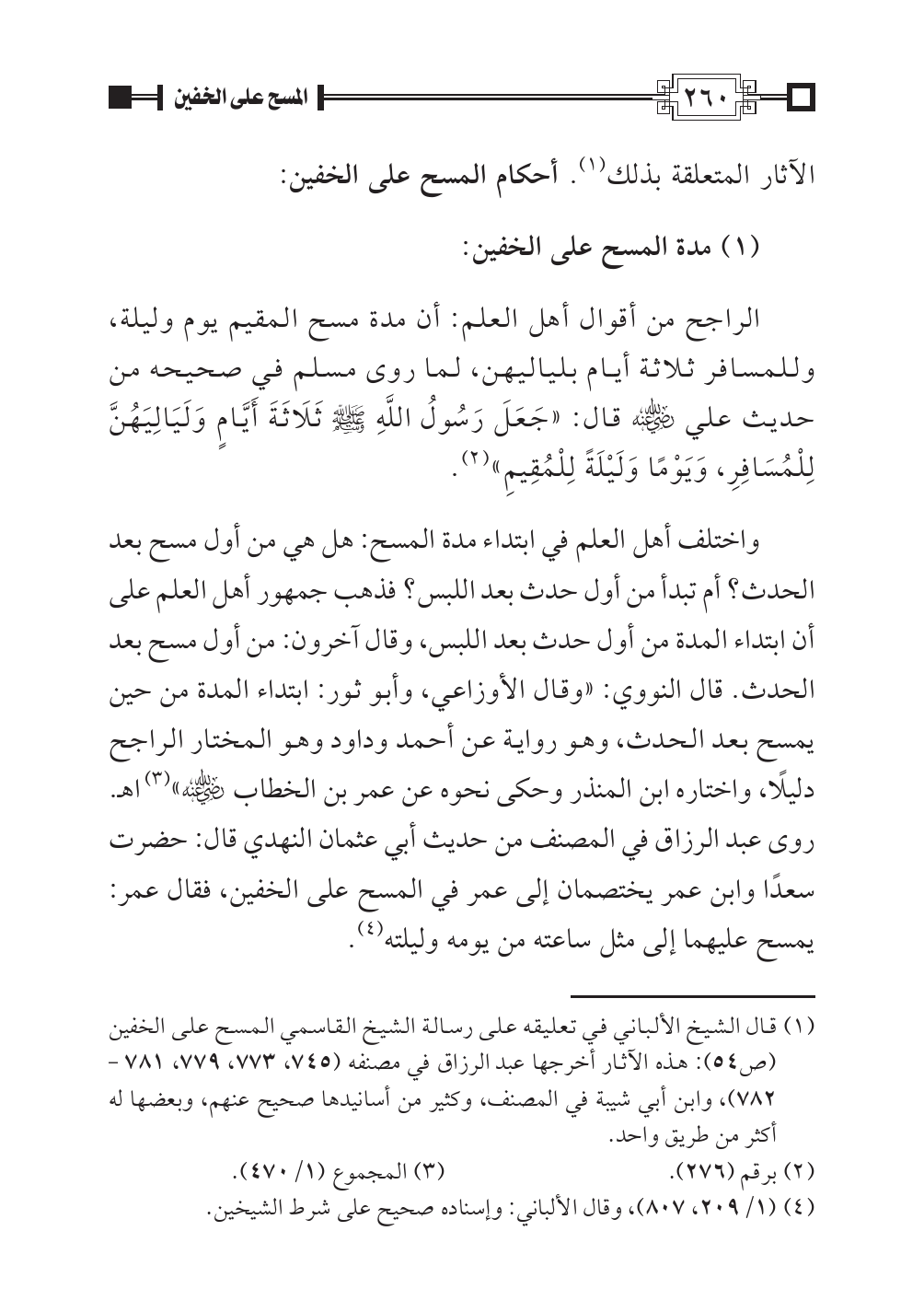 (¬١) قال الشيخ الألباني في تعليقه على رسالة الشيخ القاسمي المسح على الخفين (ص: ٥٤): هذه الآثار أخرجها عبد الرزاق في مصنفه (٧٤٥، ٧٧٣، ٧٧٩، ٧٨١ - ٧٨٢)، وابن أبي شيبة في المصنف، وكثير من أسانيدها صحيح عنهم، وبعضها له أكثر من طريق واحد.