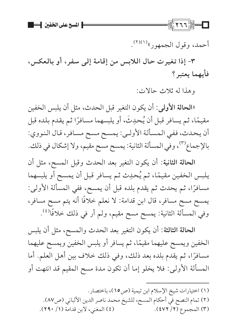 الحالة الثانية: أن يكون التغير بعد الحدث وقبل المسح، مثل أن يلبس الخفين مقيمًا، ثم يُحدِث ثم يسافر قبل أن يمسح أو يلبسهما مسافرًا، ثم يحدث ثم يقدم بلده قبل أن يمسح، ففي المسألة الأولى: يمسح مسح مسافر، قال ابن قدامة: لا نعلم خلافًا أنه يتم مسح مسافر، وفي المسألة الثانية: يمسح مسح مقيم، ولم أر في ذلك خلافًا (¬٤).