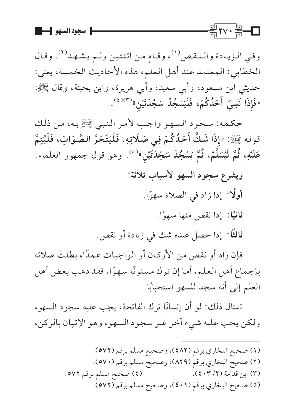 وفي الزيادة والنقص (¬١)، وقام من اثنتين ولم يشهد (¬٢). وقال الخطابي: المعتمد عند أهل العلم، هذه الأحاديث الخمسة، يعني: حديثي ابن مسعود، وأبي سعيد، وأبي هريرة، وابن بحينة، وقال صلى الله عليه وسلم: «فَإِذَا نَسِيَ أَحَدُكُمْ، فَلْيَسْجُدْ سَجْدَتَيْنِ» (¬٣) (¬٤).