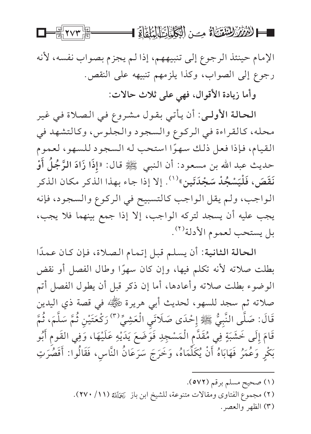 الحالة الثانية: أن يسلم قبل إتمام الصلاة، فإن كان عمدًا بطلت صلاته لأنه تكلم فيها، وإن كان سهوًا وطال الفصل أو نقض الوضوء بطلت صلاته وأعادها، أما إن ذكر قبل أن يطول الفصل أتم صلاته ثم سجد للسهو، لحديث أبي هريرة رضي الله عنه في قصة ذي اليدين قَالَ: صَلَّى النَّبِيُّ صلى الله عليه وسلم إِحْدَى صَلَاتَيِ الْعَشِيِّ (¬٣) رَكْعَتَيْنِ ثُمَّ سَلَّمَ، ثُمَّ قَامَ إِلَى خَشَبَةٍ فِي مُقَدَّمِ الْمَسْجِدِ فَوَضَعَ يَدَيْهِ عَلَيْهَا، وَفِي القَومِ أَبُو بَكْرٍ وَعُمَرُ فَهَابَاهُ أَنْ يُكَلِّمَاهُ، وَخَرَجَ سَرَعَانُ النَّاسِ، فَقَالُوا: أَقَصُرَتِ