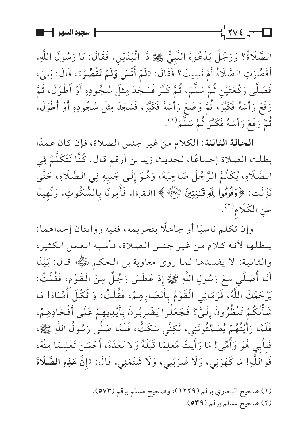 الحالة الثالثة: الكلام من غير جنس الصلاة، فإن كان عمدًا بطلت الصلاة إجماعًا، لحديث زيد بن أرقم قال: كُنَّا نَتَكَلَّمُ فِي الصَّلَاةِ، يُكَلِّمُ الرَّجُلُ صَاحِبَهُ، وَهُوَ إِلَى جَنبِهِ فِي الصَّلَاةِ، حَتَّى نَزَلَت: {وَقُومُوا لِلّهِ قَانِتِين} [البقرة: ٢٣٨]، فَأُمِرنَا بِالسُّكُوتِ، وَنُهِينَا عَنِ الكَلَامِ (¬٢).