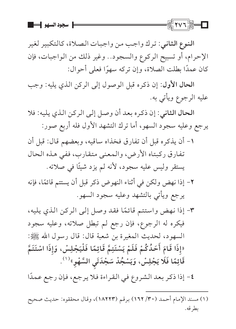 ٣ - إذا نهض واستتم قائمًا فقد وصل إلى الركن الذي يليه، فيكره له الرجوع، فإن رجع لم تبطل صلاته، وعليه سجود السهود، لحديث المغيرة بن شعبة قال: قال رسول الله صلى الله عليه وسلم: «إِذَا قَامَ أَحَدُكُمْ فَلَمْ يَسْتَتِمَّ قَائِمًا فَلْيَجْلِسْ، وَإِذَا اسْتَتَمَّ قَائِمًا فَلَا يَجْلِسْ، وَيَسْجُدْ سَجْدَتَيِ السَّهْوِ» (¬١).