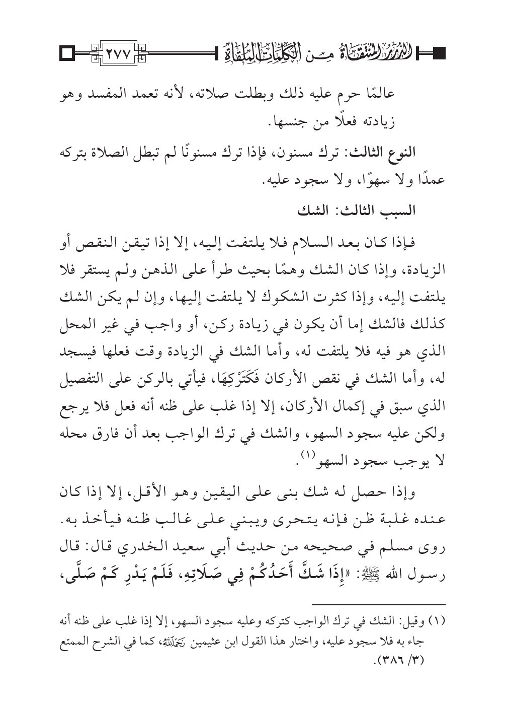 (¬١) وقيل: الشك في ترك الواجب كتركه وعليه سجود السهو، إلا إذا غلب على ظنه أنه جاء به فلا سجود عليه، واختار هذا القول ابن عثيمين رحمه الله، كما في الشرح الممتع (٣/ ٣٨٦).
