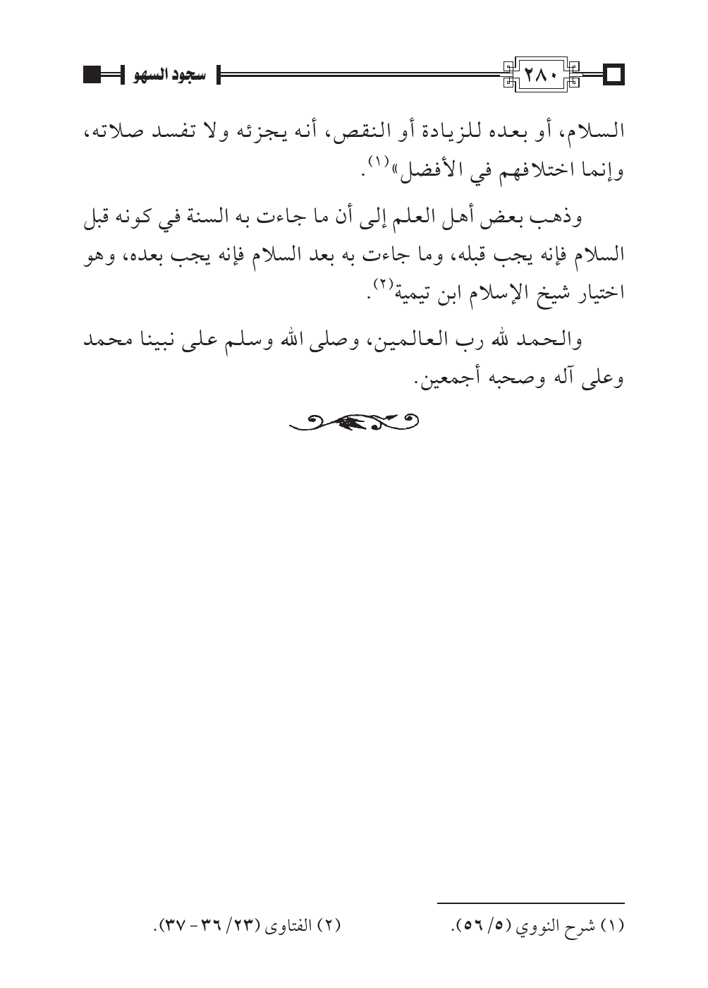 وذهب بعض أهل العلم إلى أن ما جاءت به السنة في كونه قبل السلام فإنه يجب قبله، وما جاءت به بعد السلام فإنه يجب بعده، وهو اختيار شيخ الإسلام ابن تيمية (¬٢).