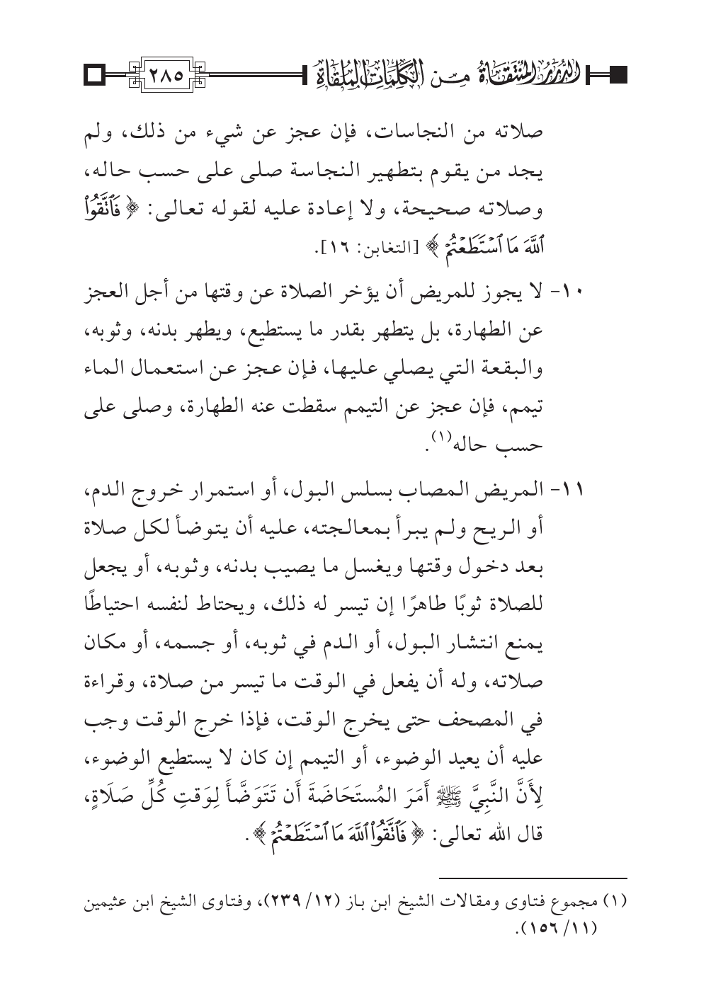 ١١ - المريض المصاب بسلس البول، أو استمرار خروج الدم، أو الريح ولم يبرأ بمعالجته، عليه أن يتوضأ لكل صلاة بعد دخول وقتها ويغسل ما يصيب بدنه، وثوبه، أو يجعل للصلاة ثوبًا طاهرًا إن تيسر له ذلك، ويحتاط لنفسه احتياطًا يمنع انتشار البول، أو الدم في ثوبه، أو جسمه، أو مكان صلاته، وله أن يفعل في الوقت ما تيسر من صلاة، وقراءة في المصحف حتى يخرج الوقت، فإذا خرج الوقت وجب عليه أن يعيد الوضوء، أو التيمم إن كان لا يستطيع الوضوء، لِأَنَّ النَّبِيَّ صلى الله عليه وسلم أَمَرَ المُستَحَاضَةَ أَن تَتَوَضَّأَ لِوَقتِ كُلِّ صَلَاةٍ، قال الله تعالى: {فَاتَّقُوا اللَّهَ مَا اسْتَطَعْتُمْ}.