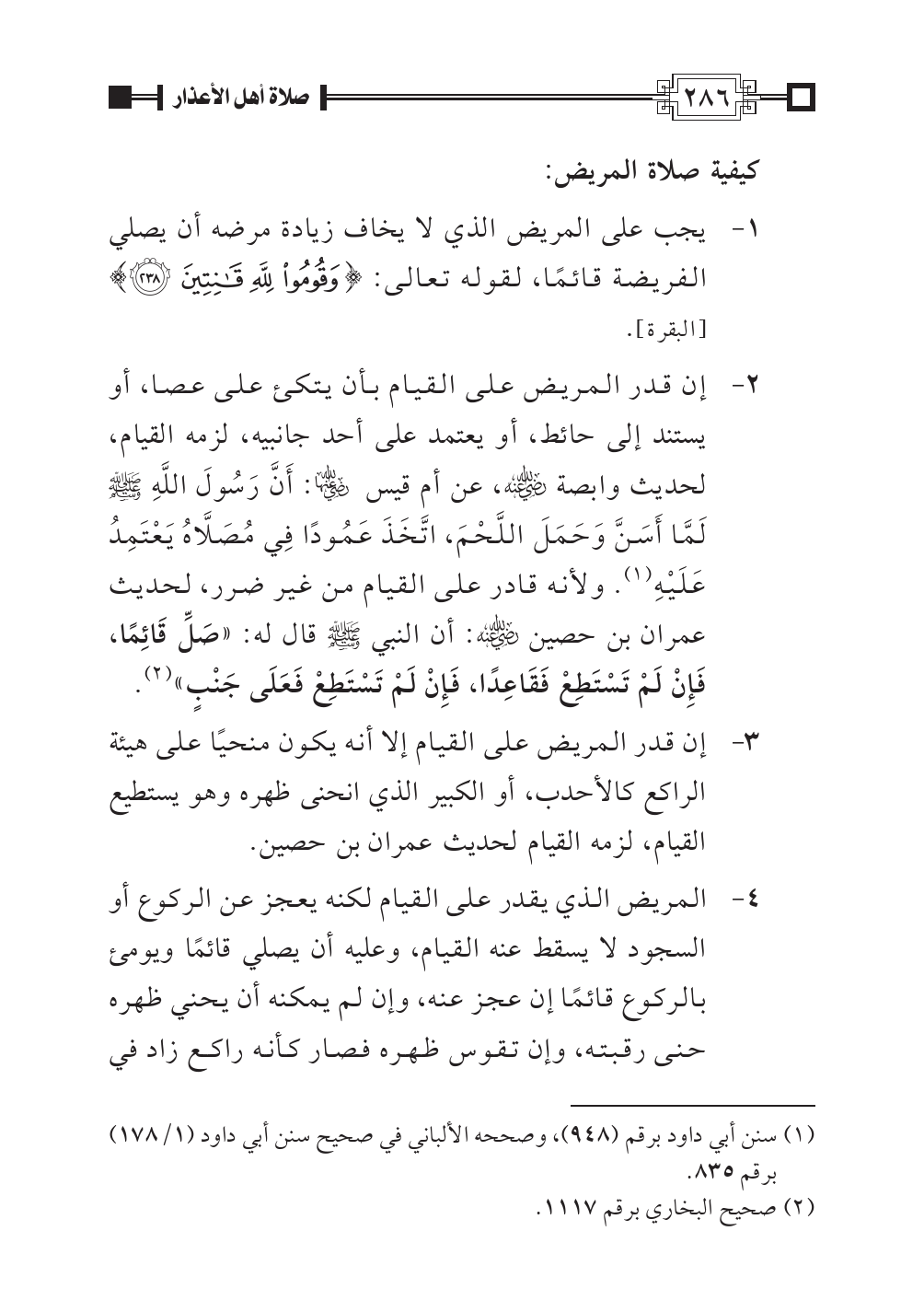 ٤ - المريض الذي يقدر على القيام لكنه يعجز عن الركوع أو السجود لا يسقط عنه القيام، وعليه أن يصلي قائمًا ويومئ بالركوع قائمًا إن عجز عنه، وإن لم يمكنه أن يحني ظهره حنى رقبته، وإن تقوس ظهره فصار كأنه راكع زاد في