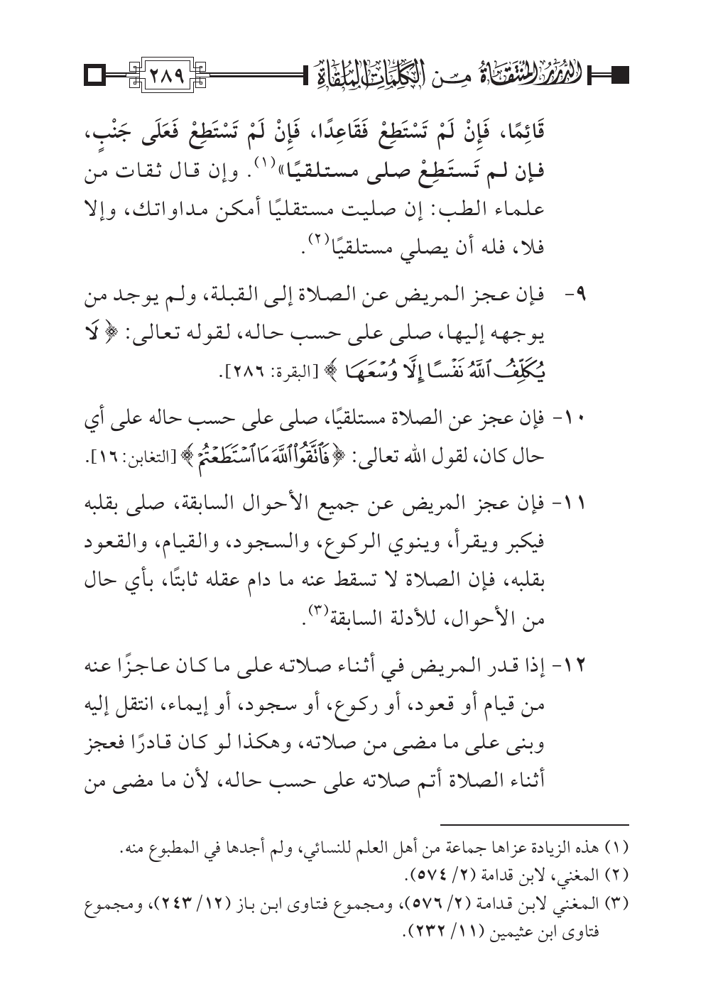 ١١ - فإن عجز المريض عن جميع الأحوال السابقة، صلى بقلبه فيكبر ويقرأ، وينوي الركوع، والسجود، والقيام، والقعود بقلبه، فإن الصلاة لا تسقط عنه ما دام عقله ثابتًا، بأي حال من الأحوال، للأدلة السابقة (¬٣).