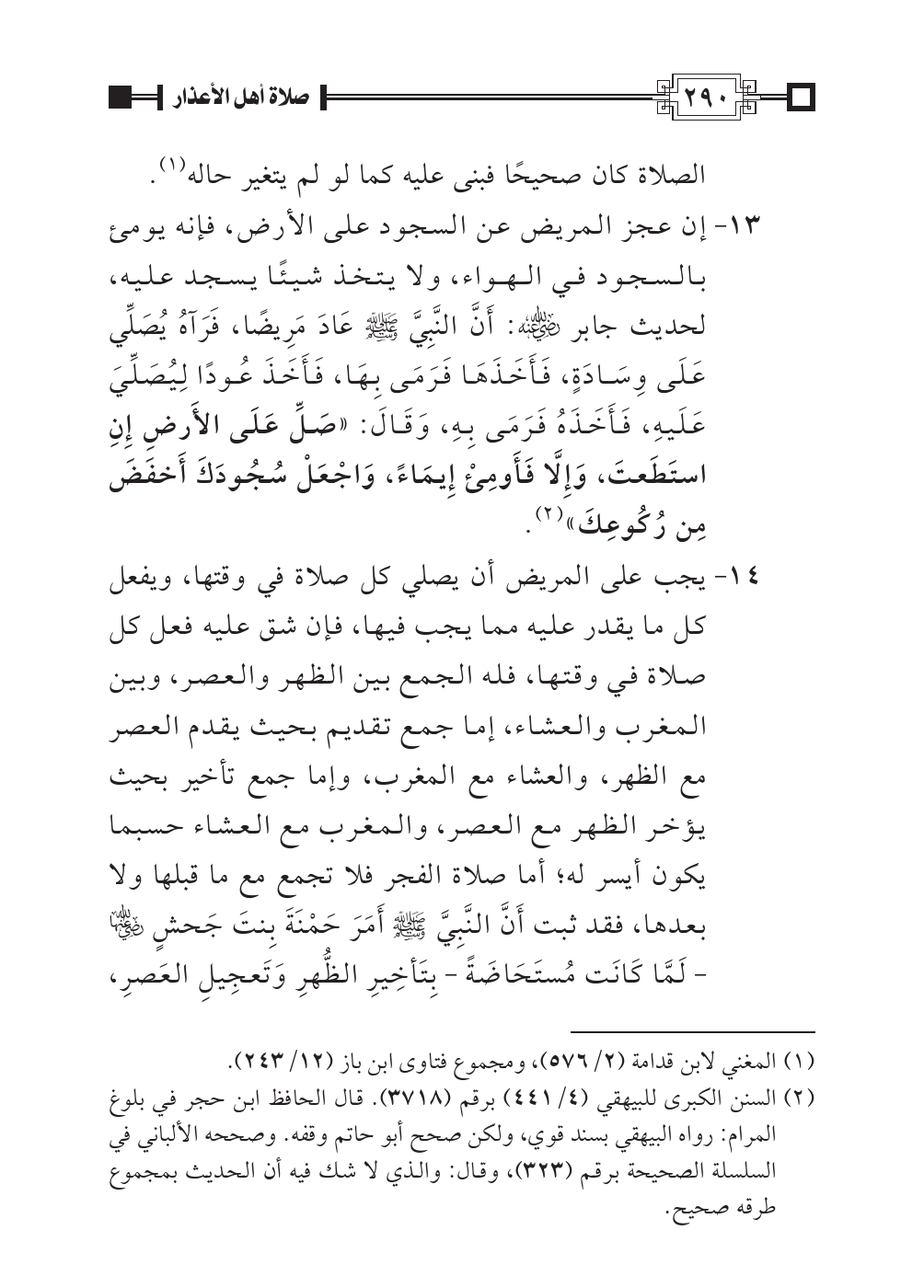 ١٤ - يجب على المريض أن يصلي كل صلاة في وقتها، ويفعل كل ما يقدر عليه مما يجب فيها، فإن شق عليه فعل كل صلاة في وقتها، فله الجمع بين الظهر والعصر، وبين المغرب والعشاء، إما جمع تقديم بحيث يقدم العصر مع الظهر، والعشاء مع المغرب، وإما جمع تأخير بحيث يؤخر الظهر مع العصر، والمغرب مع العشاء حسبما يكون أيسر له؛ أما صلاة الفجر فلا تجمع مع ما قبلها ولا بعدها، فقد ثبت أَنَّ النَّبِيَّ صلى الله عليه وسلم أَمَرَ حَمْنَةَ بِنتَ جَحشٍ رضي الله عنها - لَمَّا كَانَت مُستَحَاضَةً - بِتَأخِيرِ الظُّهرِ وَتَعجِيلِ العَصرِ،