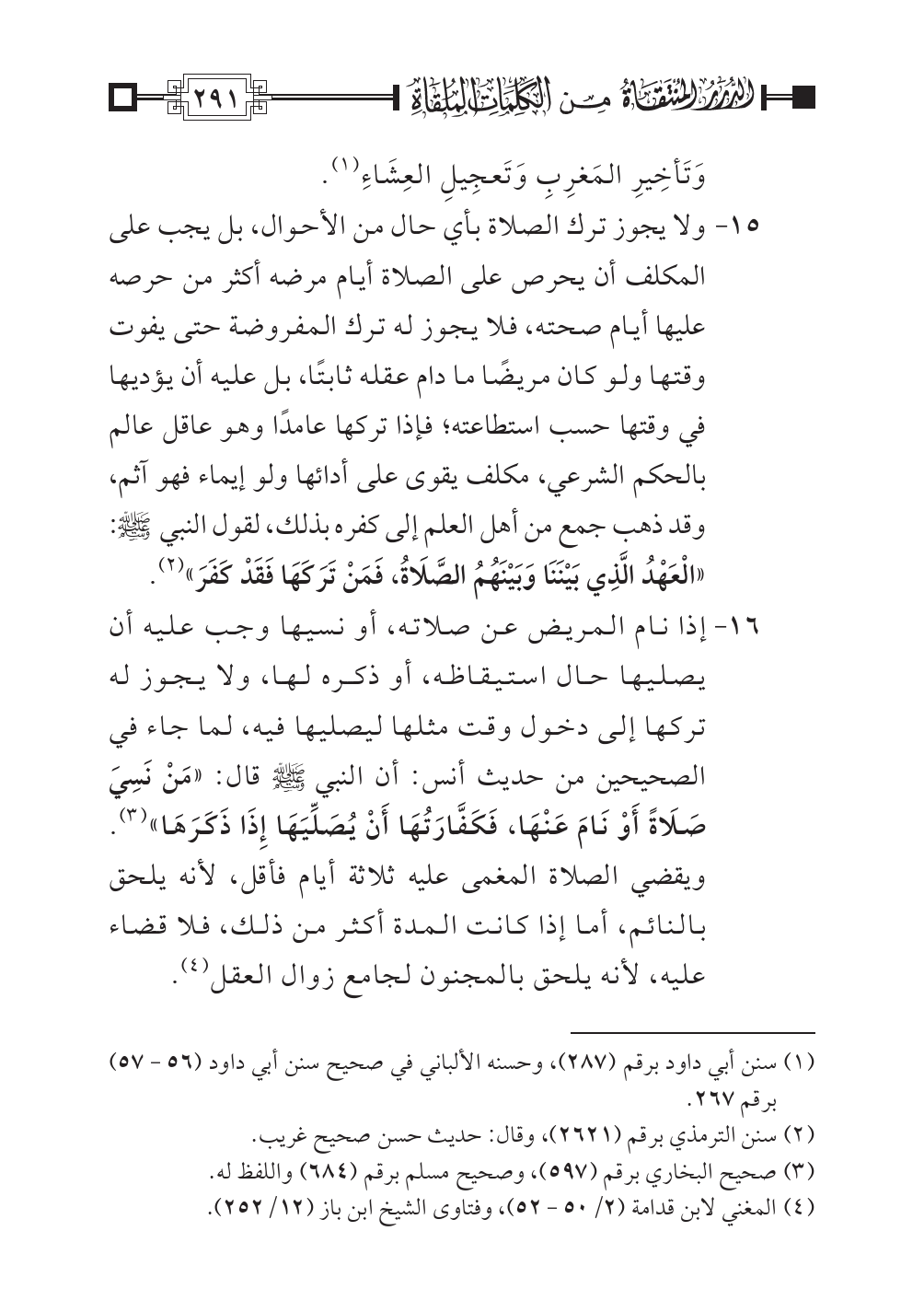 ١٥ - ولا يجوز ترك الصلاة بأي حال من الأحوال، بل يجب على المكلف أن يحرص على الصلاة أيام مرضه أكثر من حرصه عليها أيام صحته، فلا يجوز له ترك المفروضة حتى يفوت وقتها ولو كان مريضًا ما دام عقله ثابتًا، بل عليه أن يؤديها في وقتها حسب استطاعته؛ فإذا تركها عامدًا وهو عاقل عالم بالحكم الشرعي، مكلف يقوى على أدائها ولو إيماء فهو آثم، وقد ذهب جمع من أهل العلم إلى كفره بذلك، لقول النبي صلى الله عليه وسلم: «الْعَهْدُ الَّذِي بَيْنَنَا وَبَيْنَهُمُ الصَّلَاةُ، فَمَنْ تَرَكَهَا فَقَدْ كَفَرَ» (¬٢).