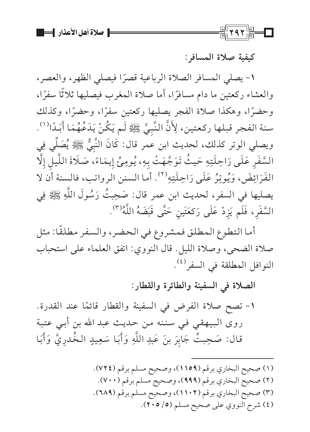 ١ - يصلي المسافر الصلاة الرباعية قصرًا فيصلي الظهر، والعصر، والعشاء ركعتين ما دام مسافرًا، أما صلاة المغرب فيصليها ثلاثًا سفرًا، وحضرًا، وهكذا صلاة الفجر يصليها ركعتين سفرًا، وحضرًا، وكذلك سنة الفجر قبلها ركعتين، لِأَنَّ النَّبِيَّ صلى الله عليه وسلم لَم يَكُنْ يَدَعُهُمَا أَبَدًا (¬١). ويصلي الوتر كذلك، لحديث ابن عمر قال: كَانَ النَّبِيُّ صلى الله عليه وسلم يُصَلِّي فِي السَّفَرِ عَلَى رَاحِلَتِهِ حَيثُ تَوَجَّهَتْ بِهِ، يُومِئُ إِيمَاءً، صَلَاةَ اللَّيلِ إِلَّا الفَرَائِضَ، وَيُوتِرُ عَلَى رَاحِلَتِهِ (¬٢). أما السنن الرواتب، فالسنة أن لا يصليها في السفر، لحديث ابن عمر قال: صَحِبتُ رَسُولَ اللَّهِ صلى الله عليه وسلم فِي السَّفَرِ، فَلَم يَزِدْ عَلَى رَكعَتَينِ حَتَّى قَبَضَهُ اللَّهُ (¬٣).