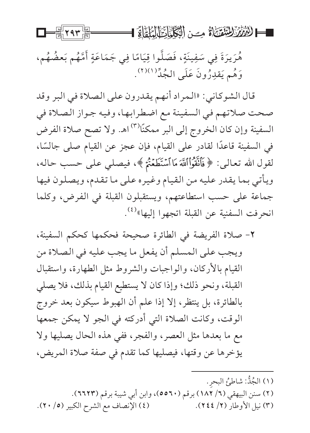 قال الشوكاني: «المراد أنهم يقدرون على الصلاة في البر وقد صحت صلاتهم في السفينة مع اضطرابها، وفيه جواز الصلاة في السفينة وإن كان الخروج إلى البر ممكنًا (¬٣) اهـ. ولا تصح صلاة الفرض في السفينة قاعدًا لقادر على القيام، فإن عجز عن القيام صلى جالسًا، لقول الله تعالى: {فَاتَّقُوا اللَّهَ مَا اسْتَطَعْتُمْ}، فيصلي على حسب حاله، ويأتي بما يقدر عليه من القيام وغيره على ما تقدم، ويصلون فيها جماعة على حسب استطاعتهم، ويستقبلون القبلة في الفرض، وكلما انحرفت السفنية عن القبلة اتجهوا إليها» (¬٤).