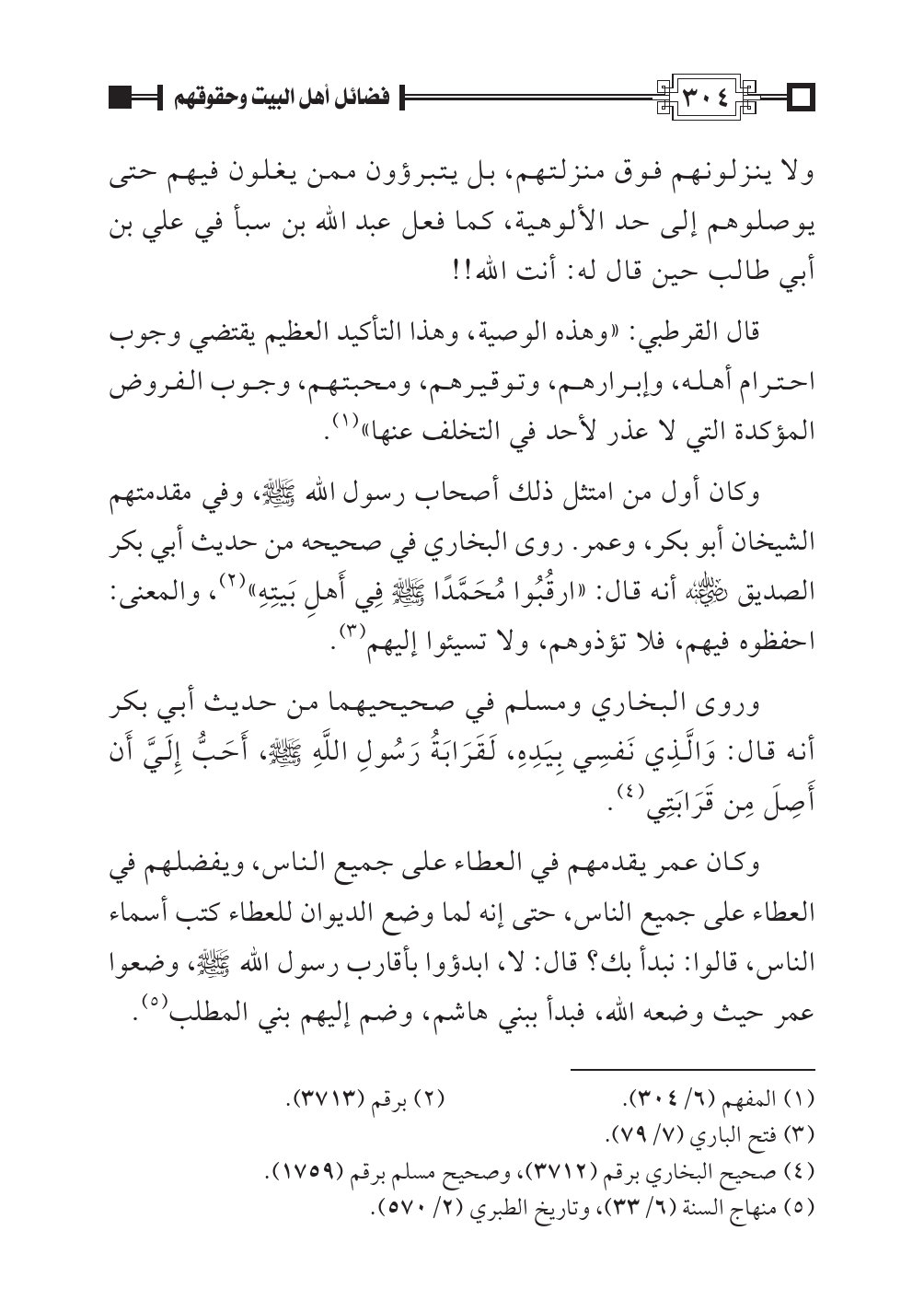وكان أول من امتثل ذلك أصحاب رسول الله صلى الله عليه وسلم، وفي مقدمتهم الشيخان أبو بكر، وعمر. روى البخاري في صحيحه من حديث أبي بكر الصديق رضي الله عنه أنه قال: «ارقُبُوا مُحَمَّدًا صلى الله عليه وسلم فِي أَهلِ بَيتِهِ» (¬٢)، والمعنى: احفظوه فيهم، فلا تؤذوهم، ولا تسيئوا إليهم (¬٣).